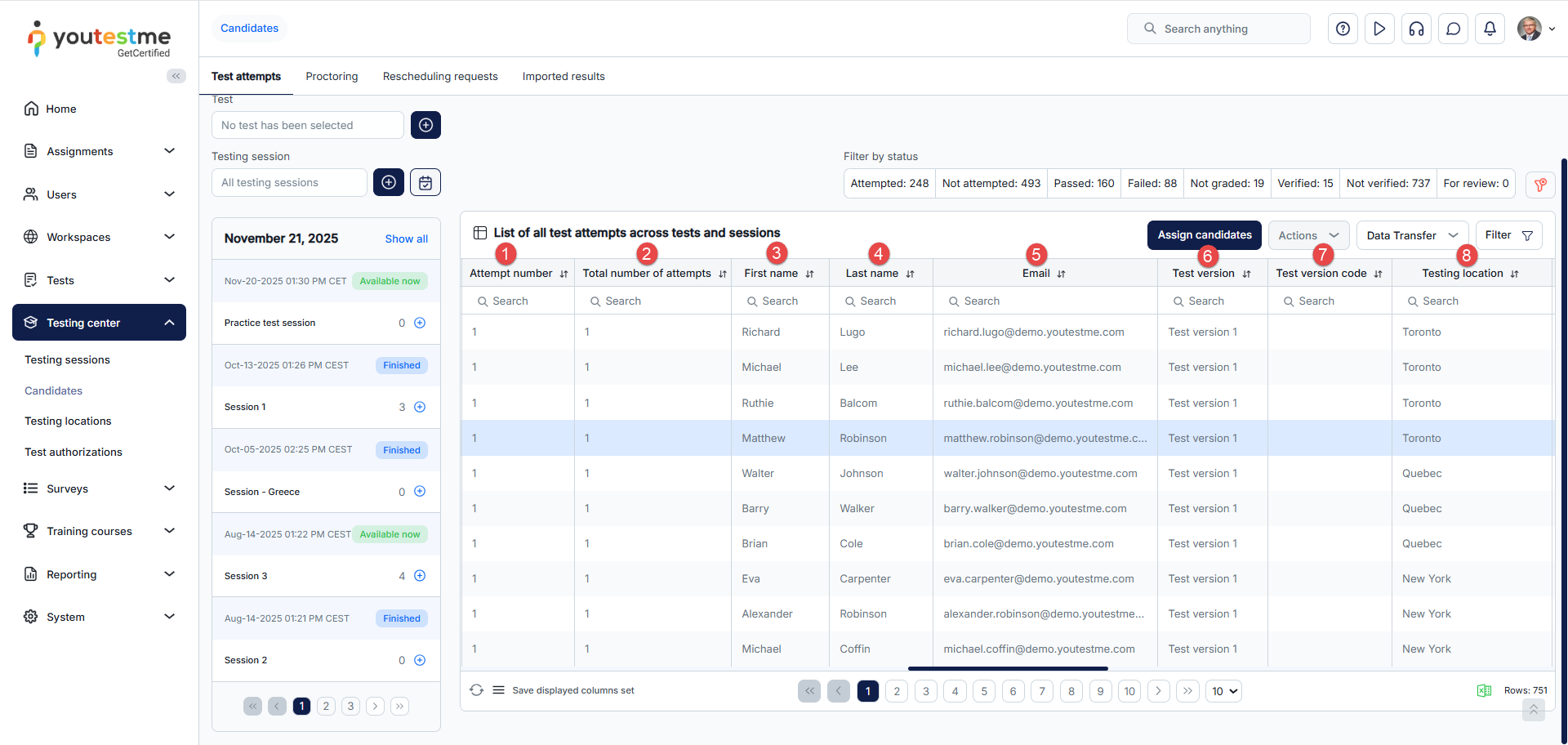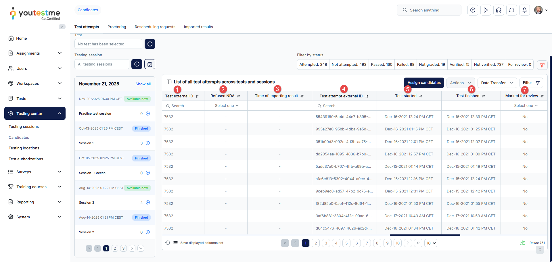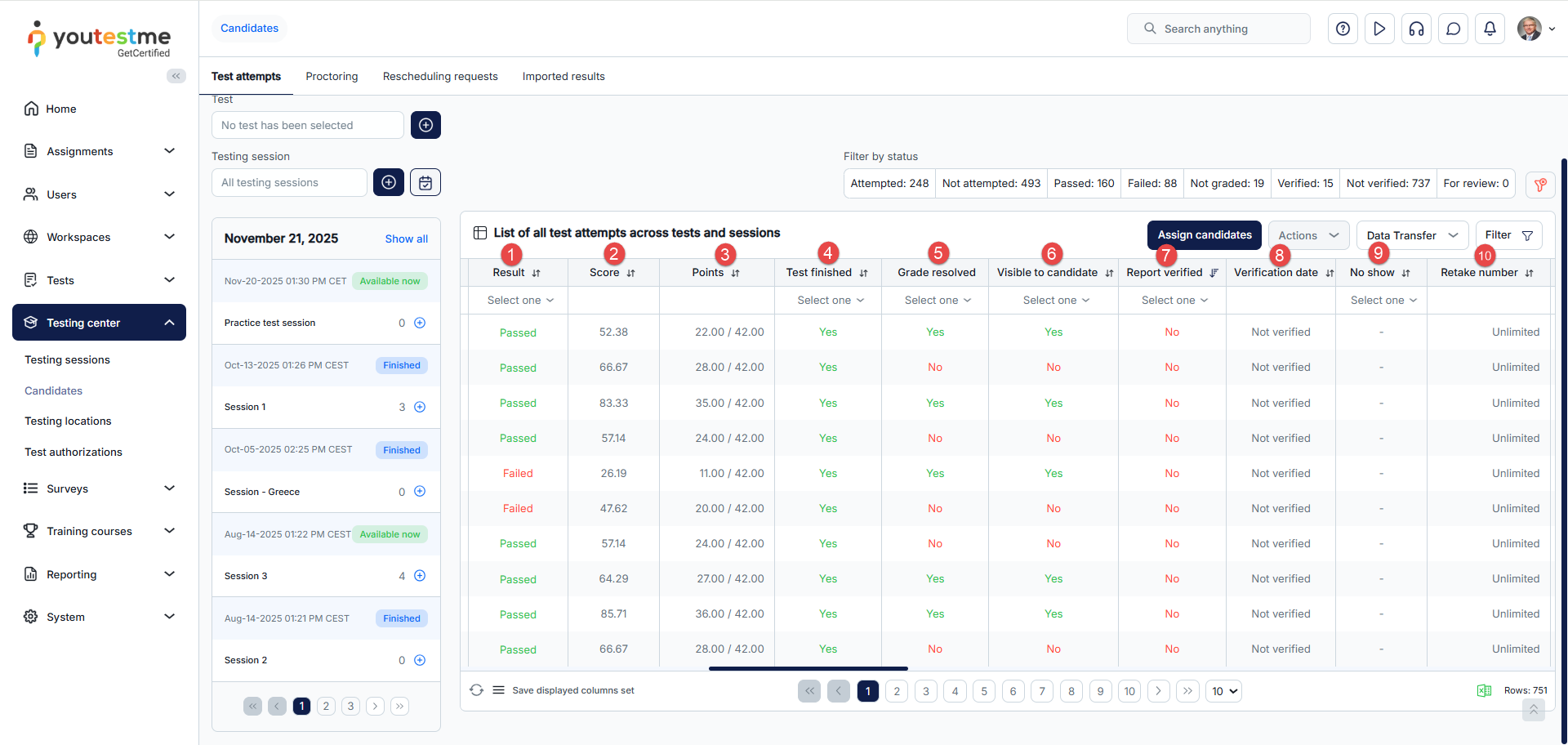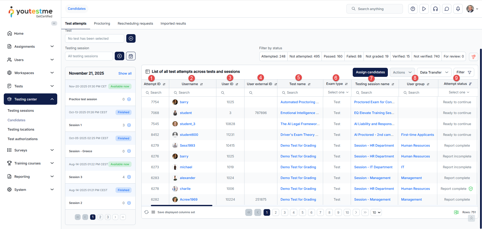 - Test attempts – Assign candidates to testing sessions or remove those already assigned, view their test attempts and grade them accordingly.