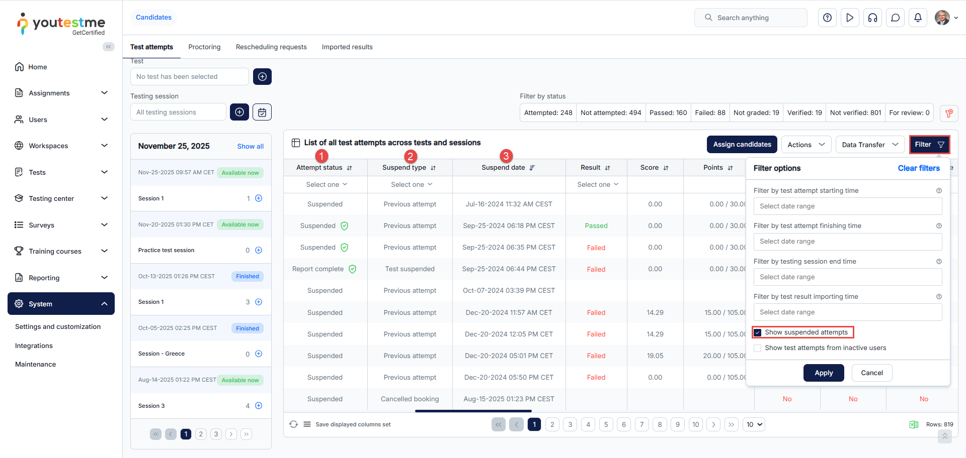 - Suspend attempt – In cases involving test-taking violations, network disruptions, or other irregularities, the active candidate attempt may be suspended, with the option to authorize a subsequent retake.
