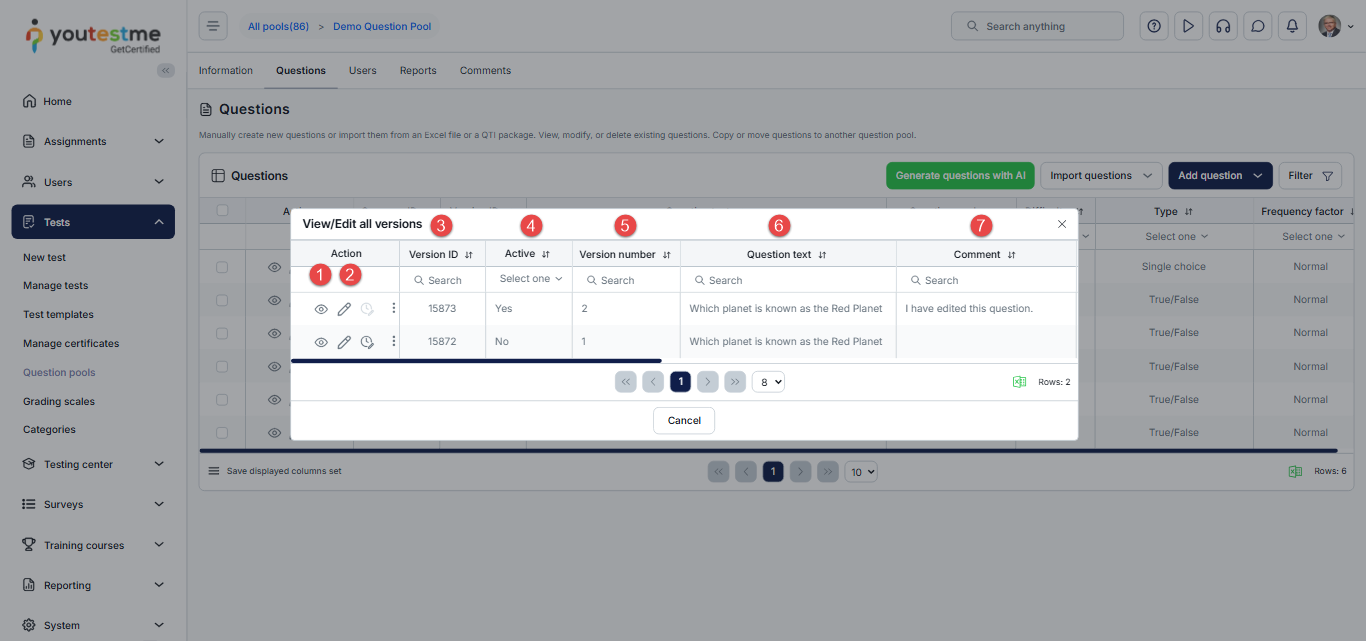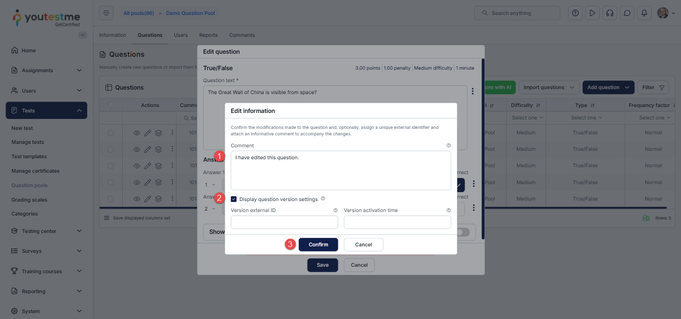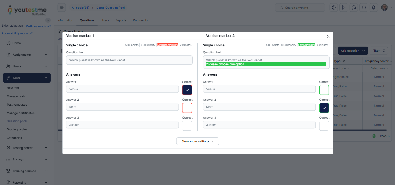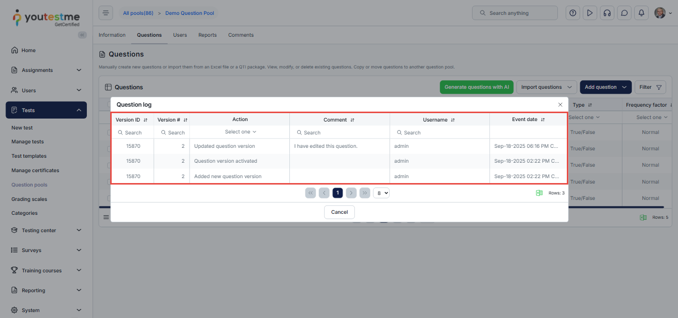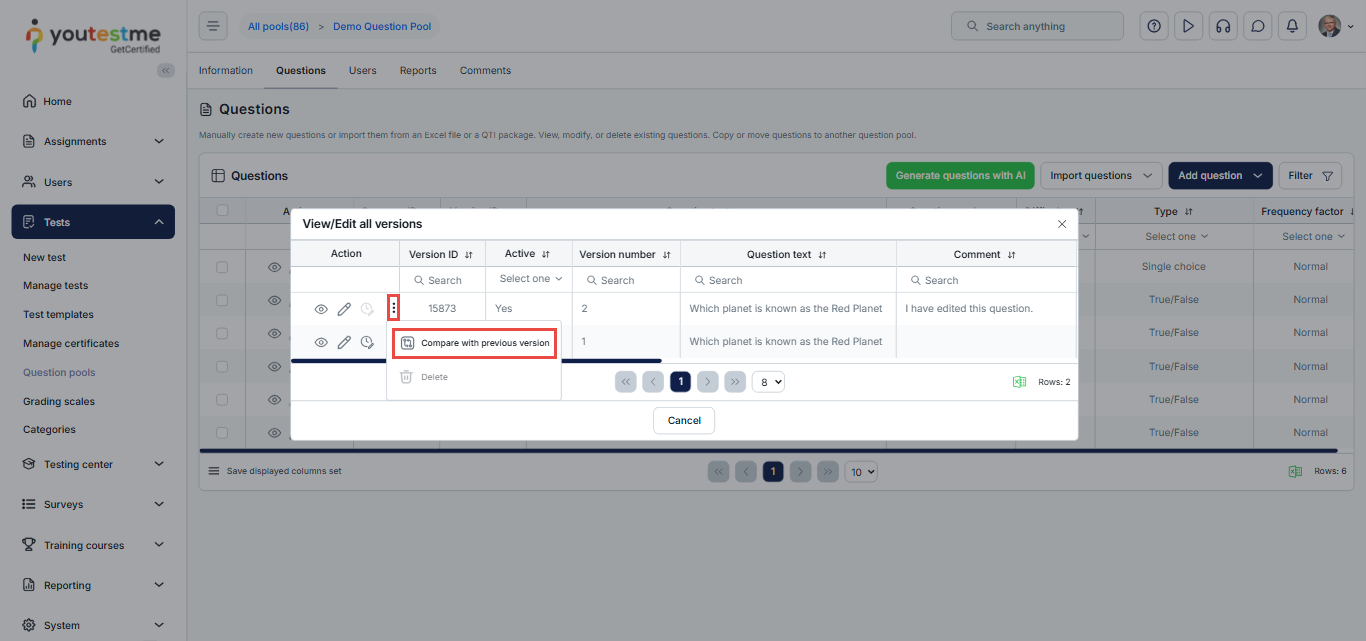 This article explains how to manage different versions of questions in YouTestMe GetCertified. Each time a question is edited, the system automatically creates a new version while keeping the same question ID. This way, you can always track what has been changed, who made the changes, and when they were made. You can also add comments to describe the reason for the change, compare different versions side by side, and even revert to an older version if needed.