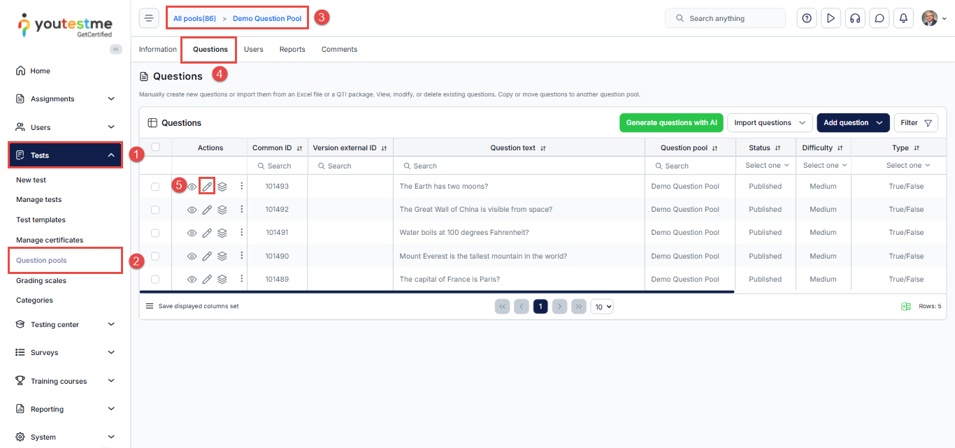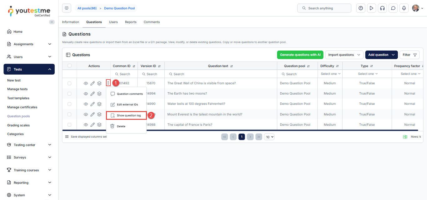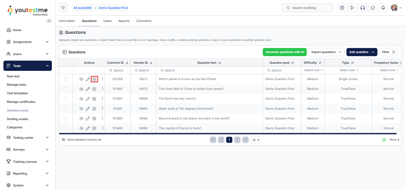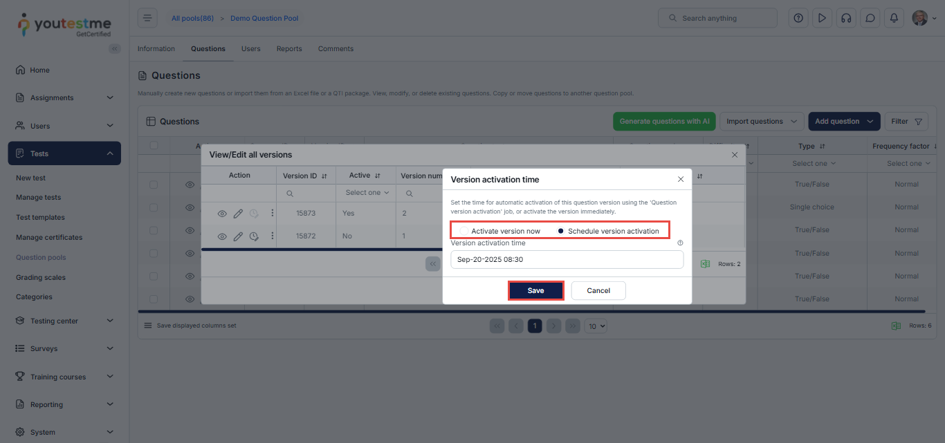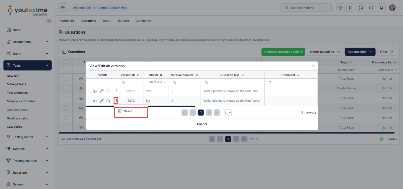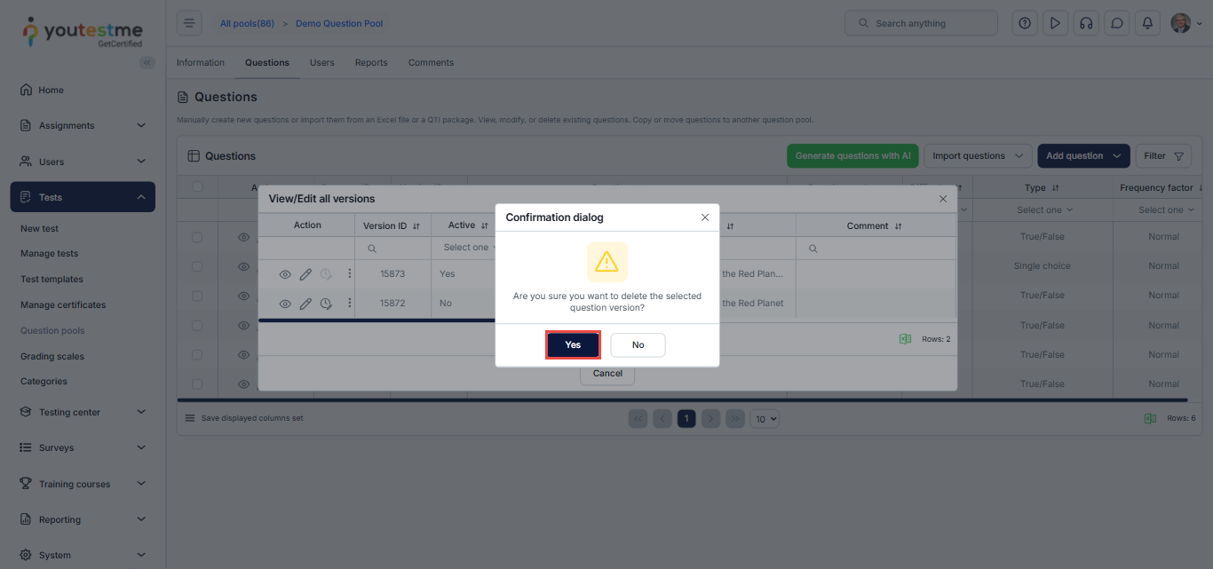This article explains how to manage different versions of questions in YouTestMe GetCertified. Each time a question is edited, the system automatically creates a new version while keeping the same question ID. This way, you can always track what has been changed, who made the changes, and when they were made. You can also add comments to describe the reason for the change, compare different versions side by side, and even revert to an older version if needed.