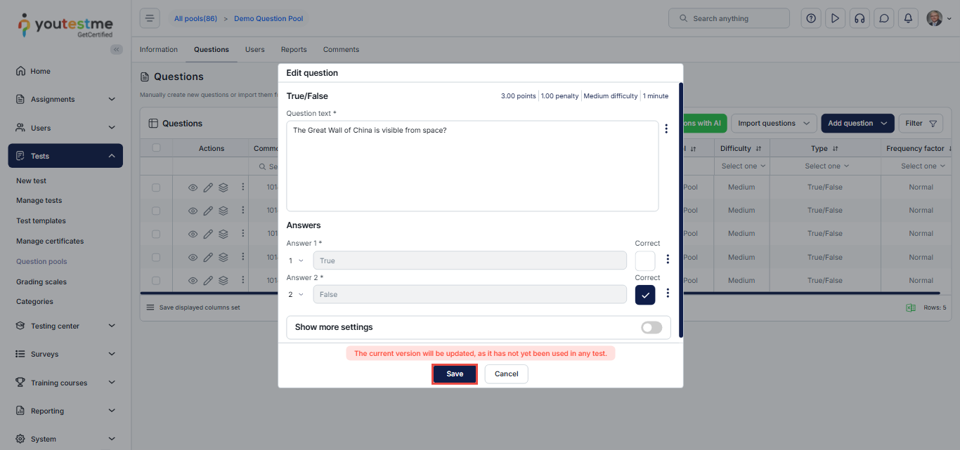 Note: If the question has not yet been used in a test, the same version will be updated. However, if the current version has already been used in a test, the system will automatically create a new version of the question.