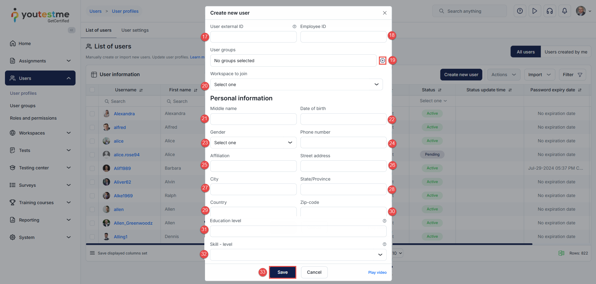 Suspended – Prevents the user from logging in until reactivated by a user manager. The results and data of suspended users remain visible in the application and included in statistics.