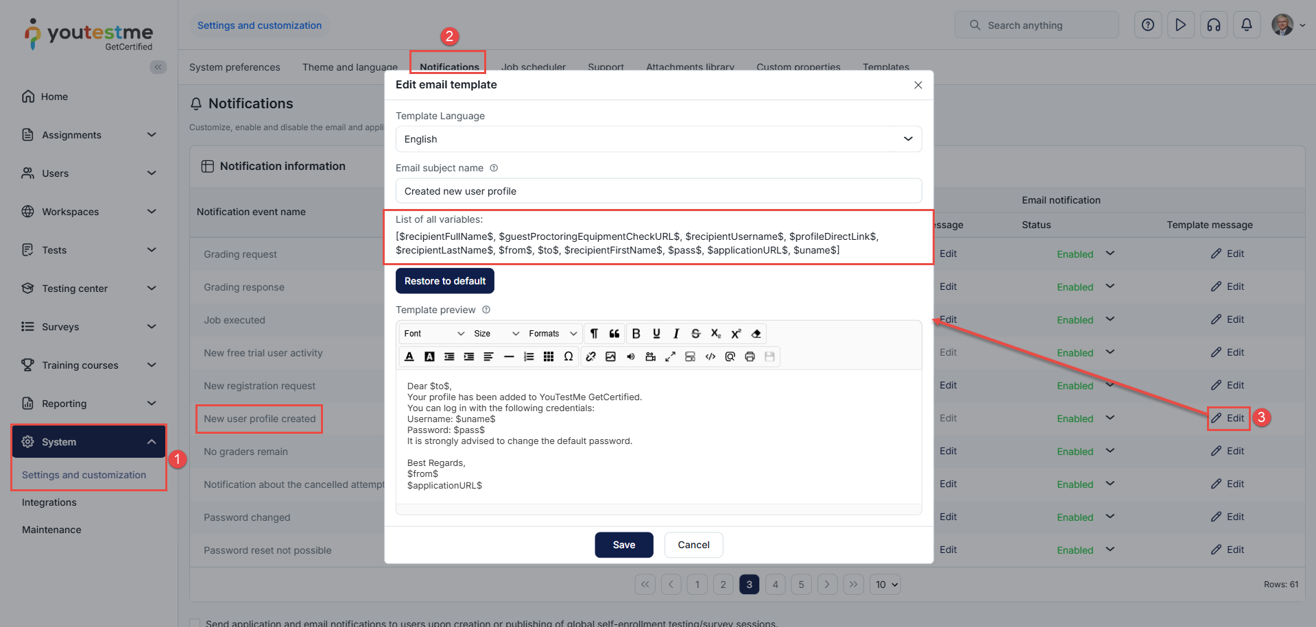 - Locate the New user profile created notification and click the Edit button in the email notification column to modify the template.
