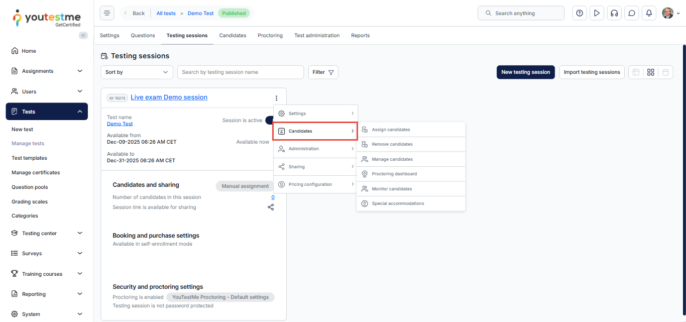 Depending on the session settings, candidates may need to be manually assigned to the session. If manual assignment is enabled. For detailed instructions on how to assign candidates to a test session, please refer to this article.