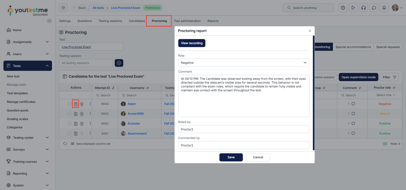 AI-proctored tests are recorded and available in the application. Assigned proctors must:
