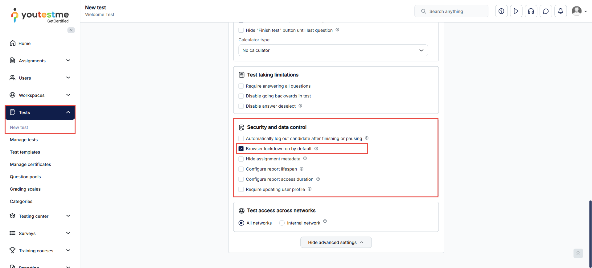 You can enable the Browser lockdown option in the Test creation wizard, on the third step, under Security and data control.
