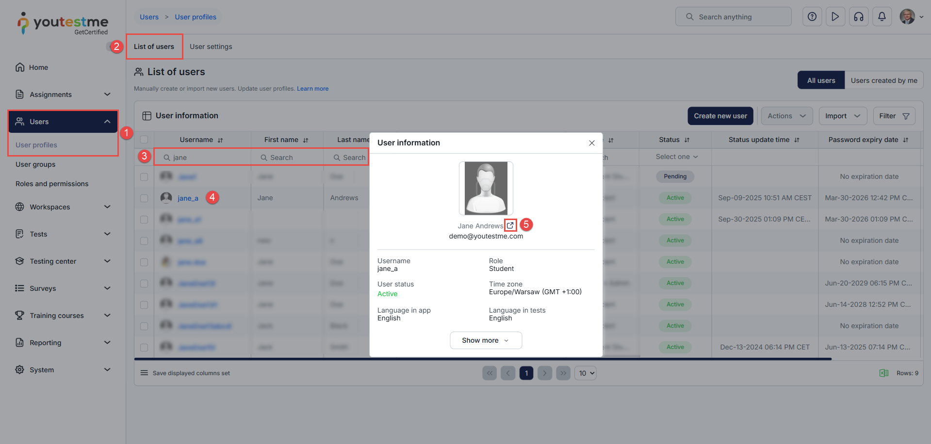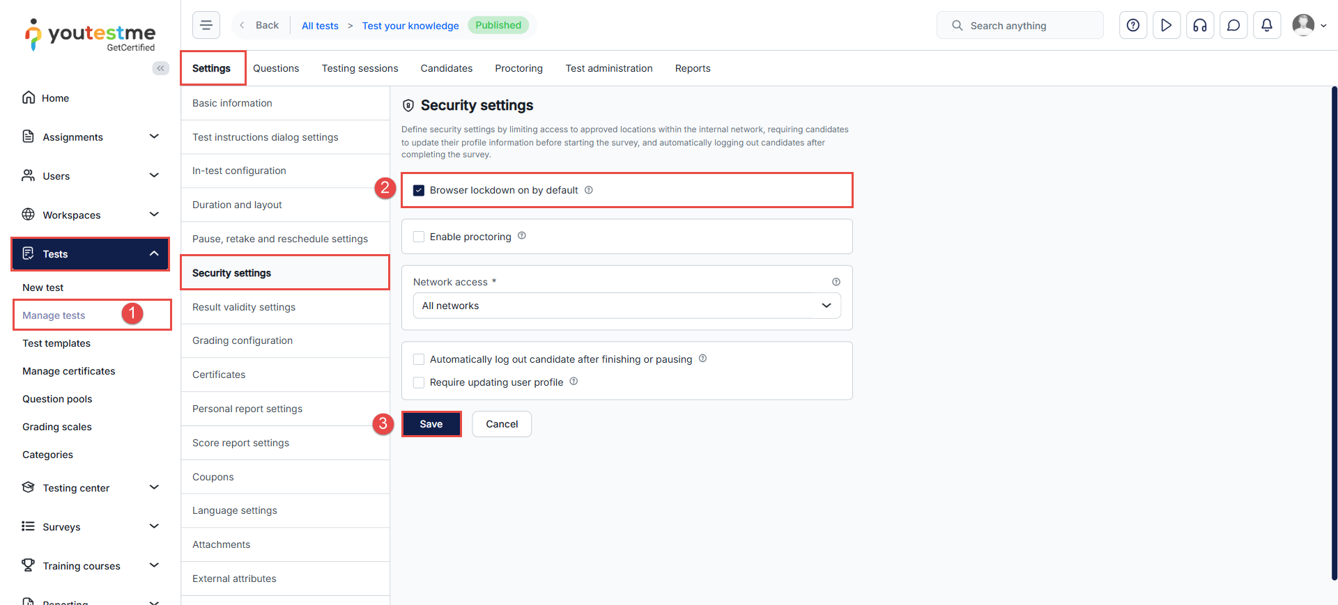 - In the Tests/Manage tests tab, select the Settings/Security settings tab.