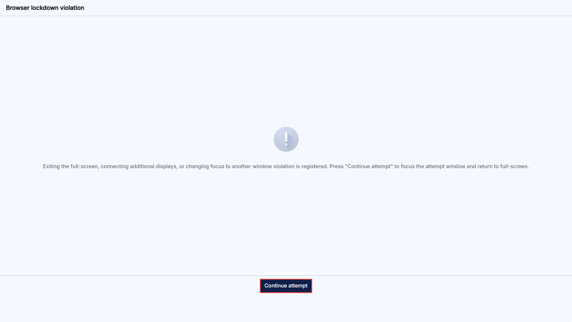 After the candidate attempts one of the forbidden actions during the test, they will be removed from the test, and a “Continue attempt” button will be displayed, allowing them to rejoin.