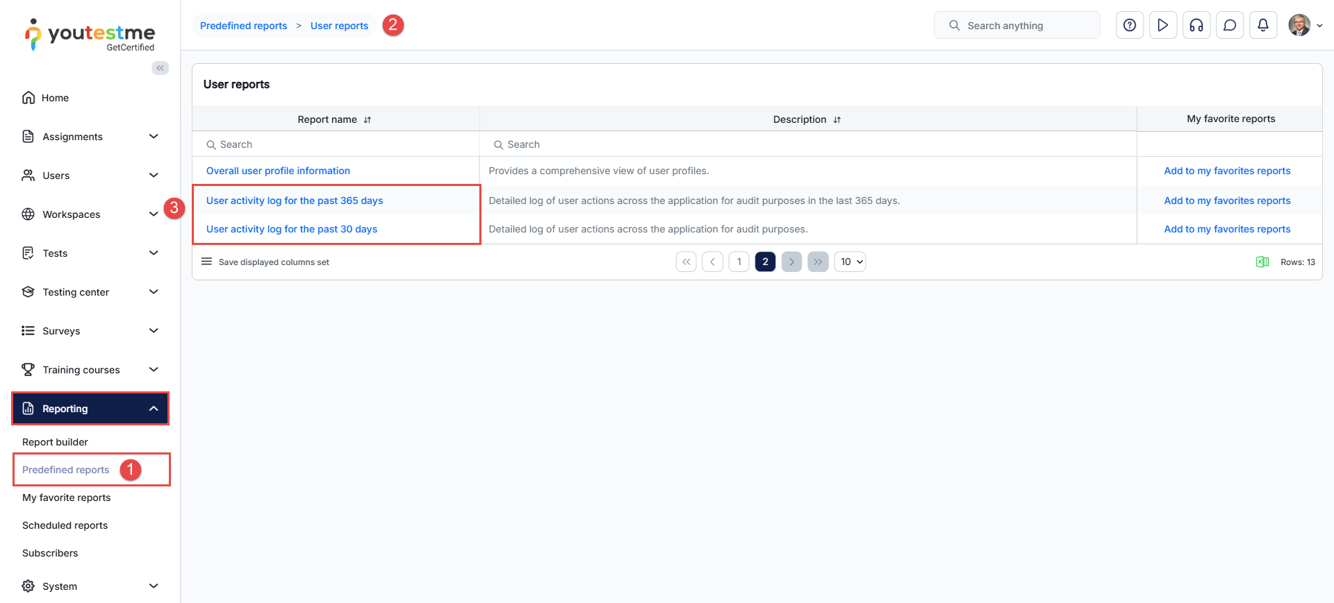 - Navigate to the Reporting page in the main menu and select Predefined reports.