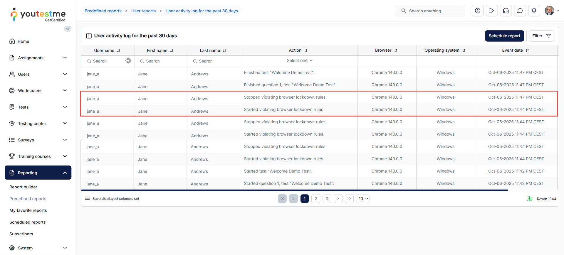 Tracking Browser Lockdown Violations with the Users Audit Trail Report
