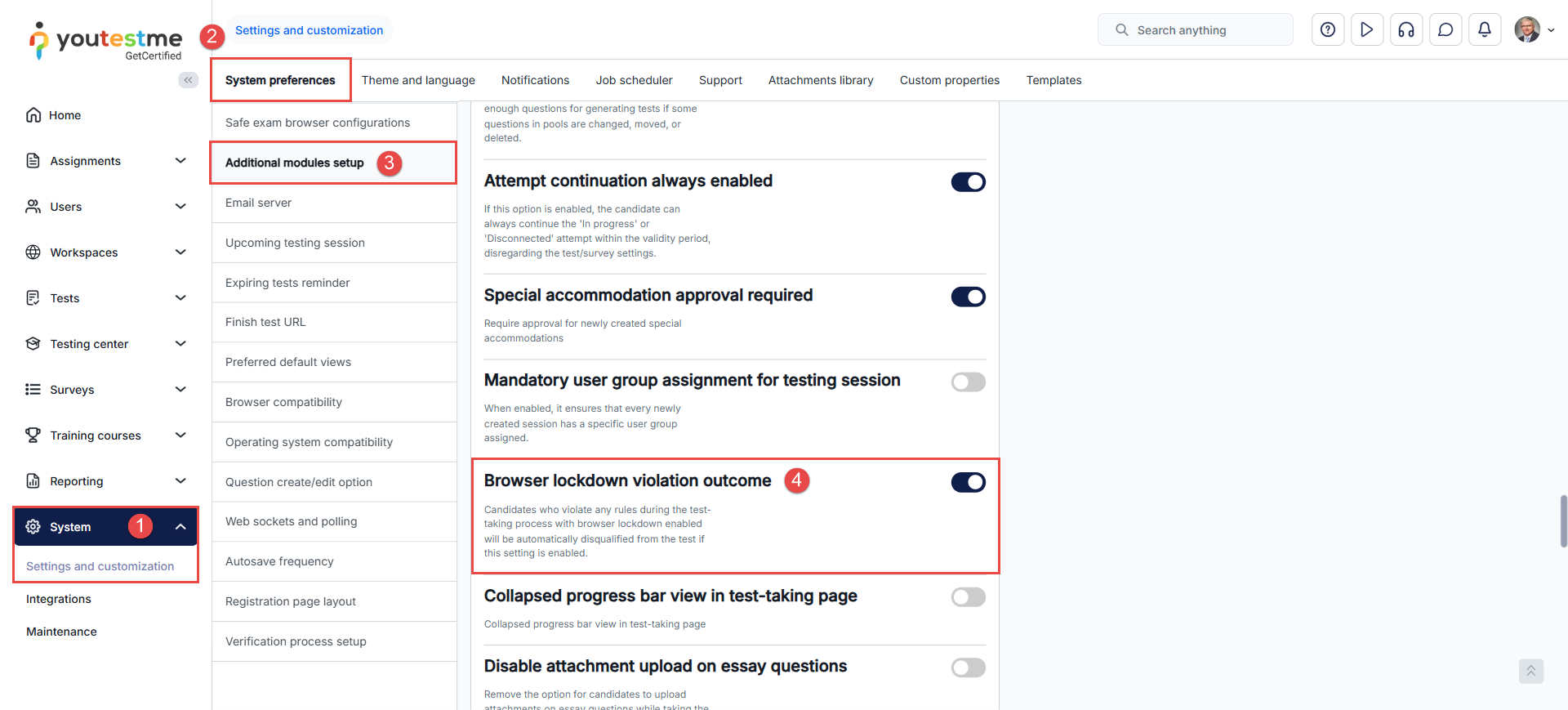 If a test warning isn’t enough security, and you want to prevent candidates from re-entering the test after rule violations, you can enable the option where candidates who violate any rules during the test with browser lockdown enabled will be automatically disqualified from the test.
