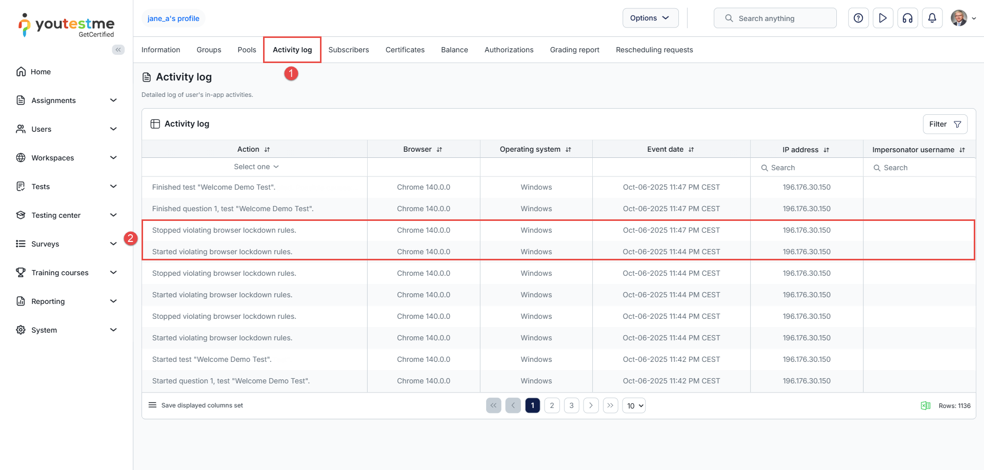 - In the Activity log, review when the candidate began and ceased violating the browser lockdown rules, along with the duration of the violations.