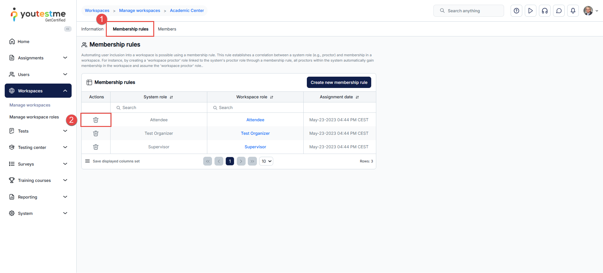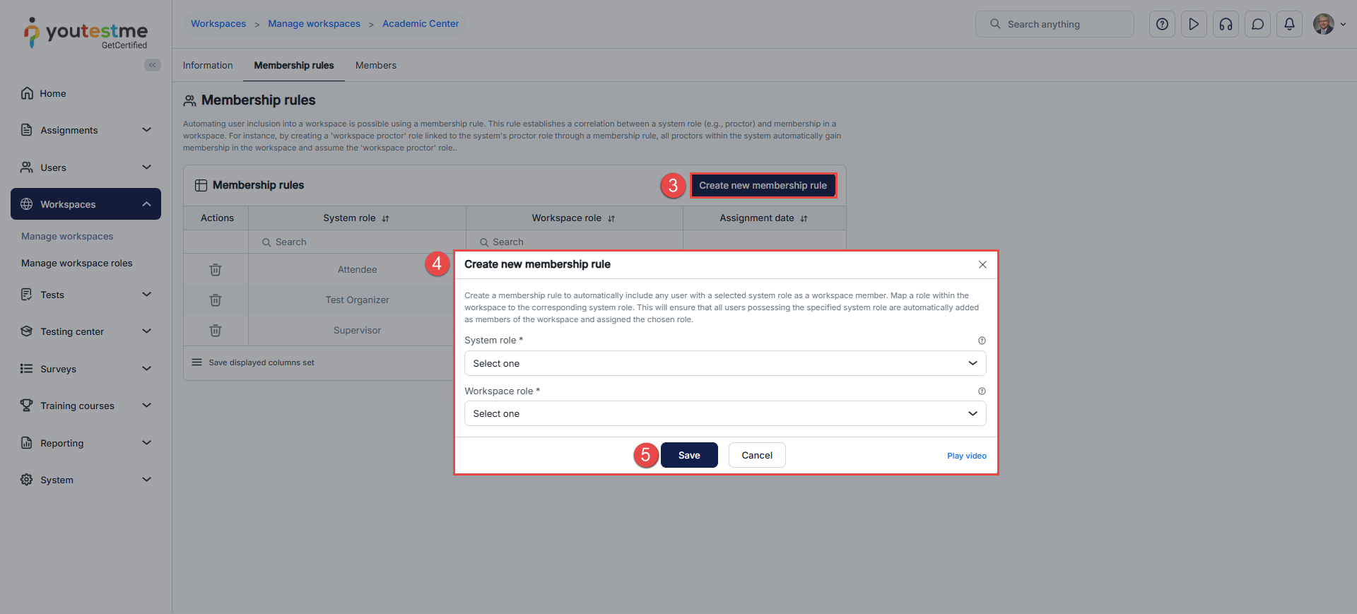 Managing workspace users is a key part of organizing your platform effectively. By combining global roles, workspace roles, and various assignment methods (manual, automatic, or through registration links), you can ensure users are placed in the right workspaces with the right permissions.