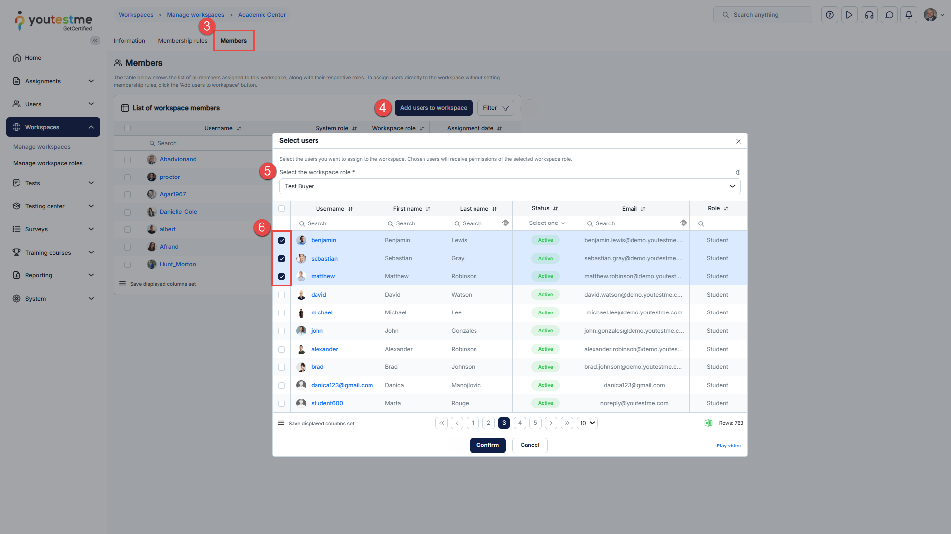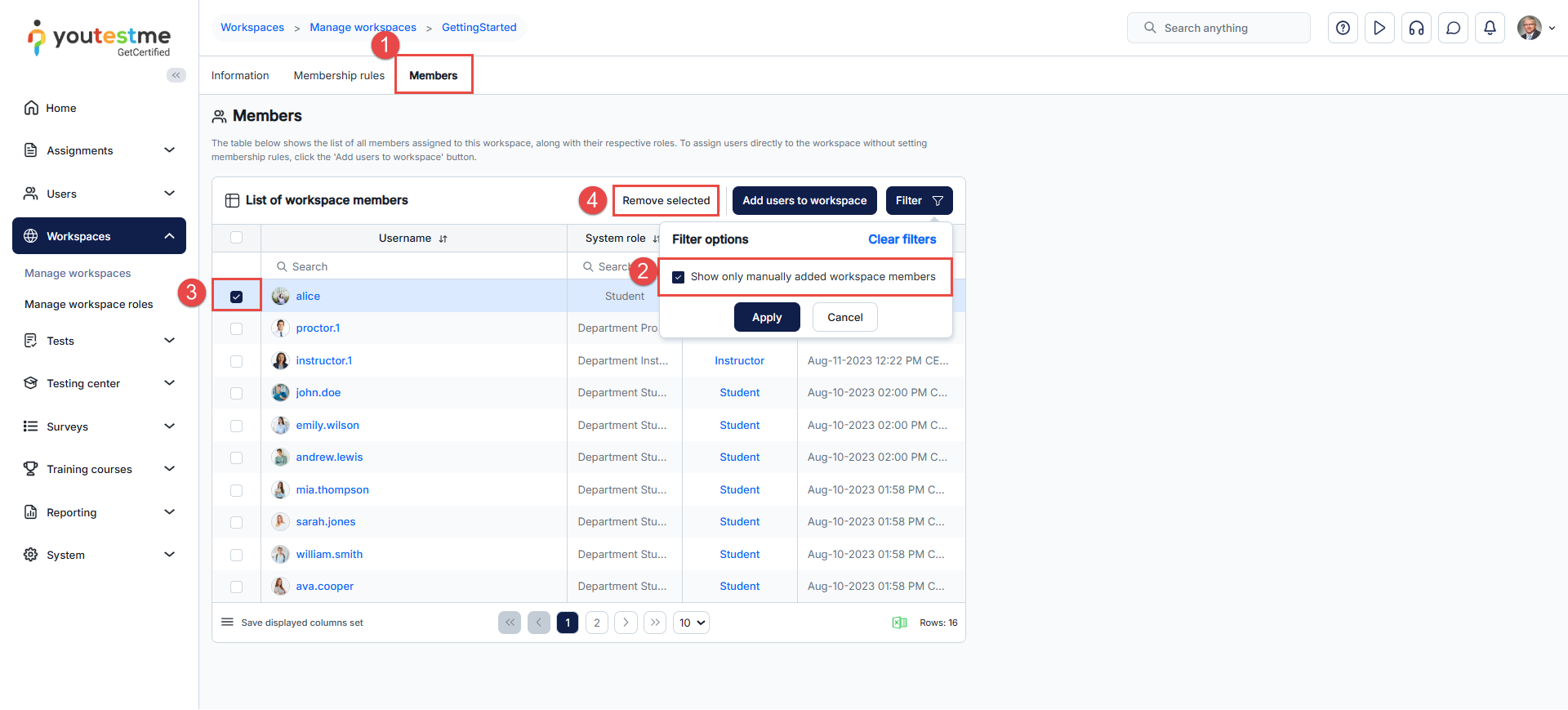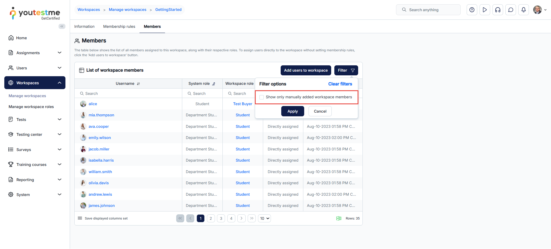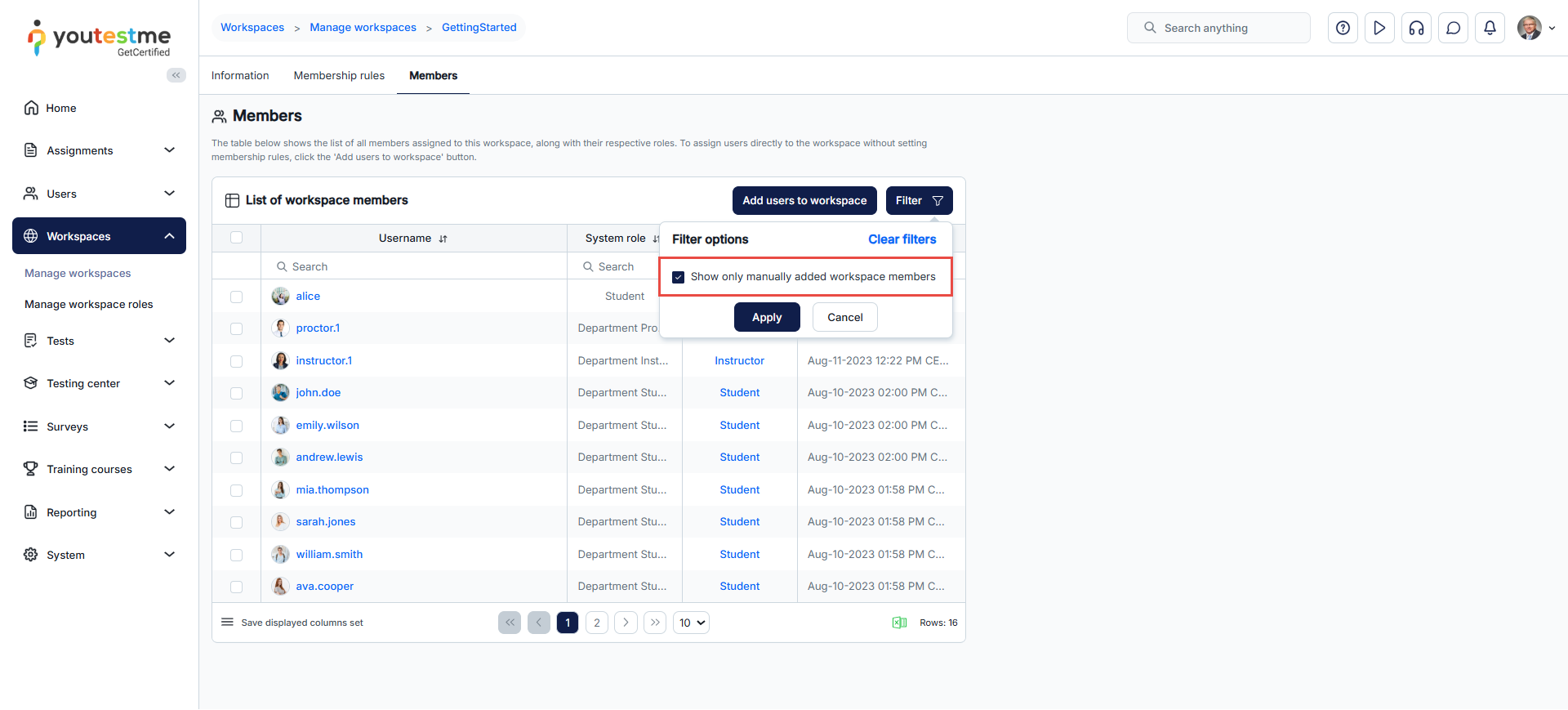 If you prefer to assign users to a specific workspace after creation, you can do so manually via the Members tab, as explained in Method 1 above.