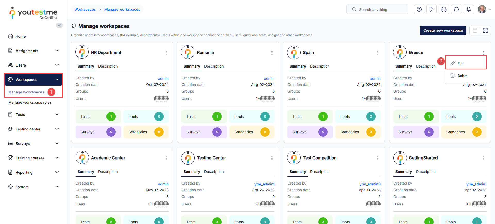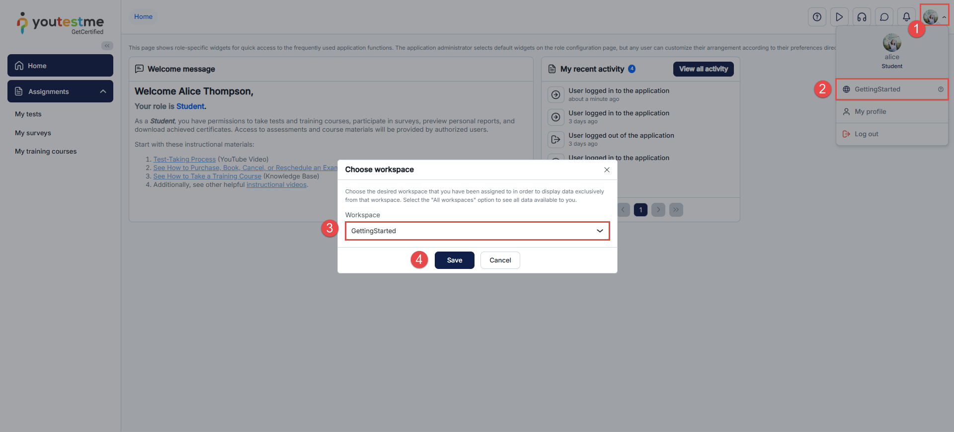All users, including candidates, can be members of multiple workspaces. This is particularly useful when users participate in different departments, training programs, or testing environments.