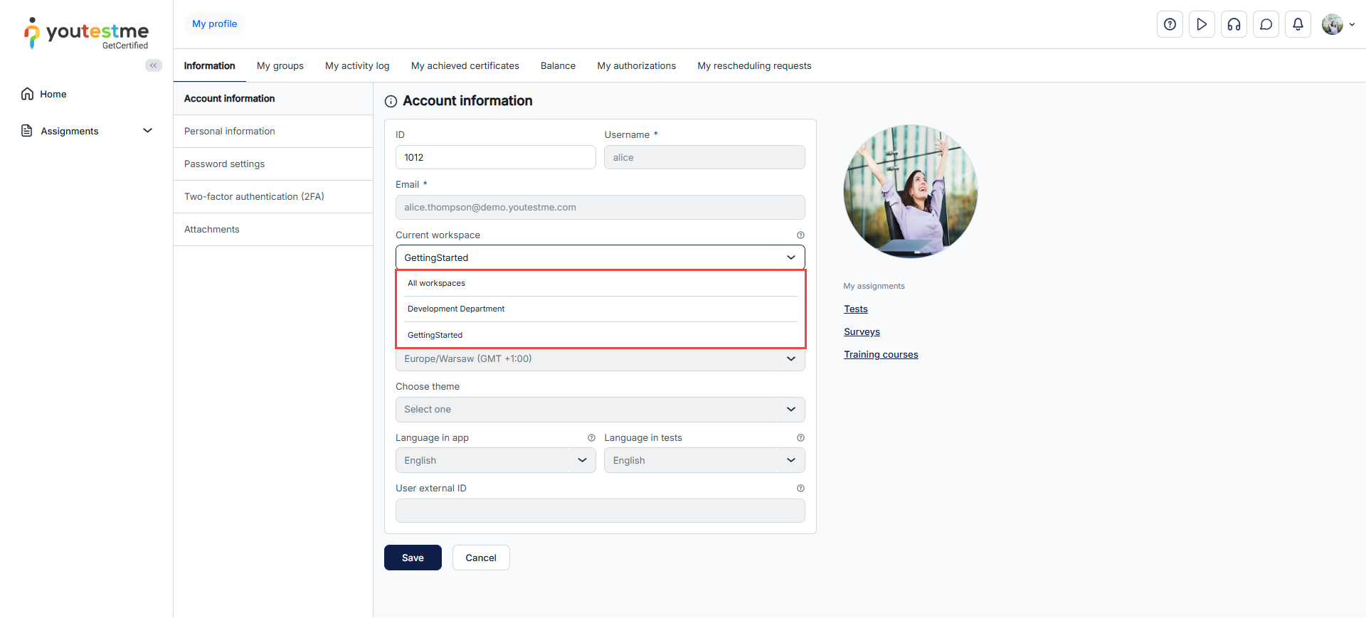 Alternatively, users can change their workspace from the profile page by selecting the desired workspace from the dropdown menu and saving the changes.