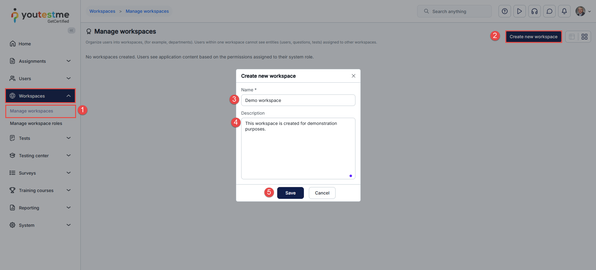 Example 1 – An organization with multiple departments. The HR department workspace can have onboarding training, job satisfaction surveys, and similar, and the IT department workspace can have tests related to development procedures. Still, both can have access to the cyber security test that needs to be done by everyone in the organization.