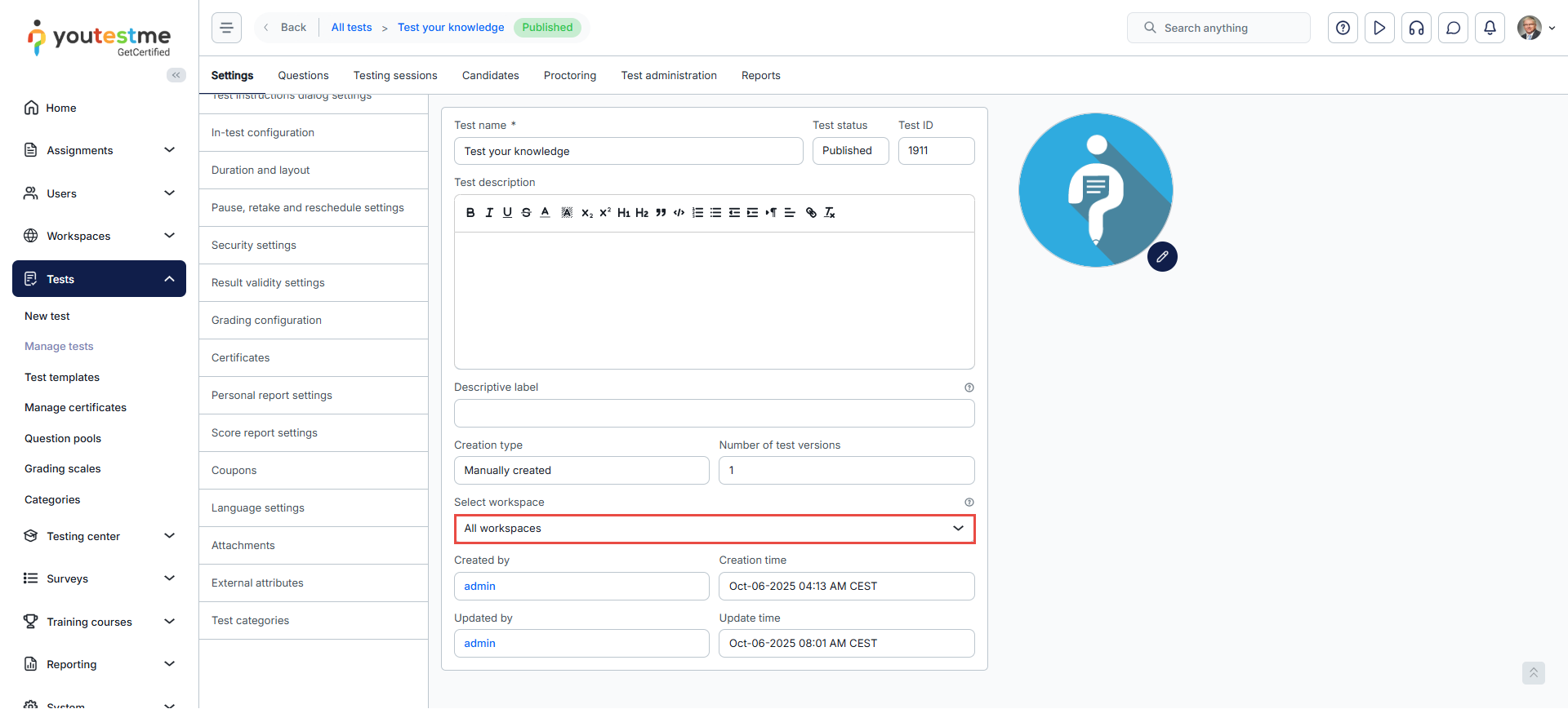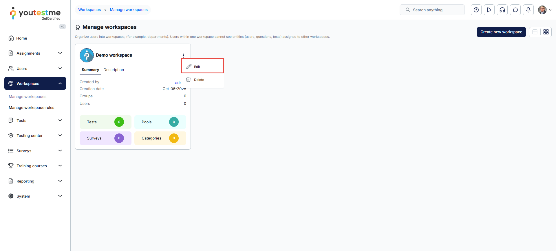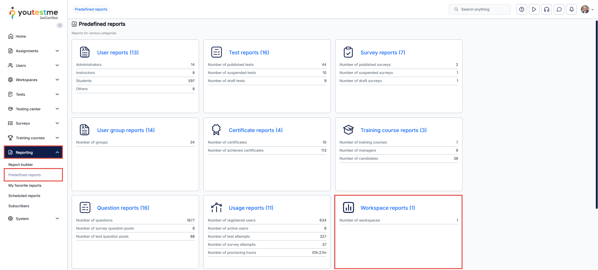 - The number of tests, surveys, training courses, user groups, question categories, and test pools within each workspace.
