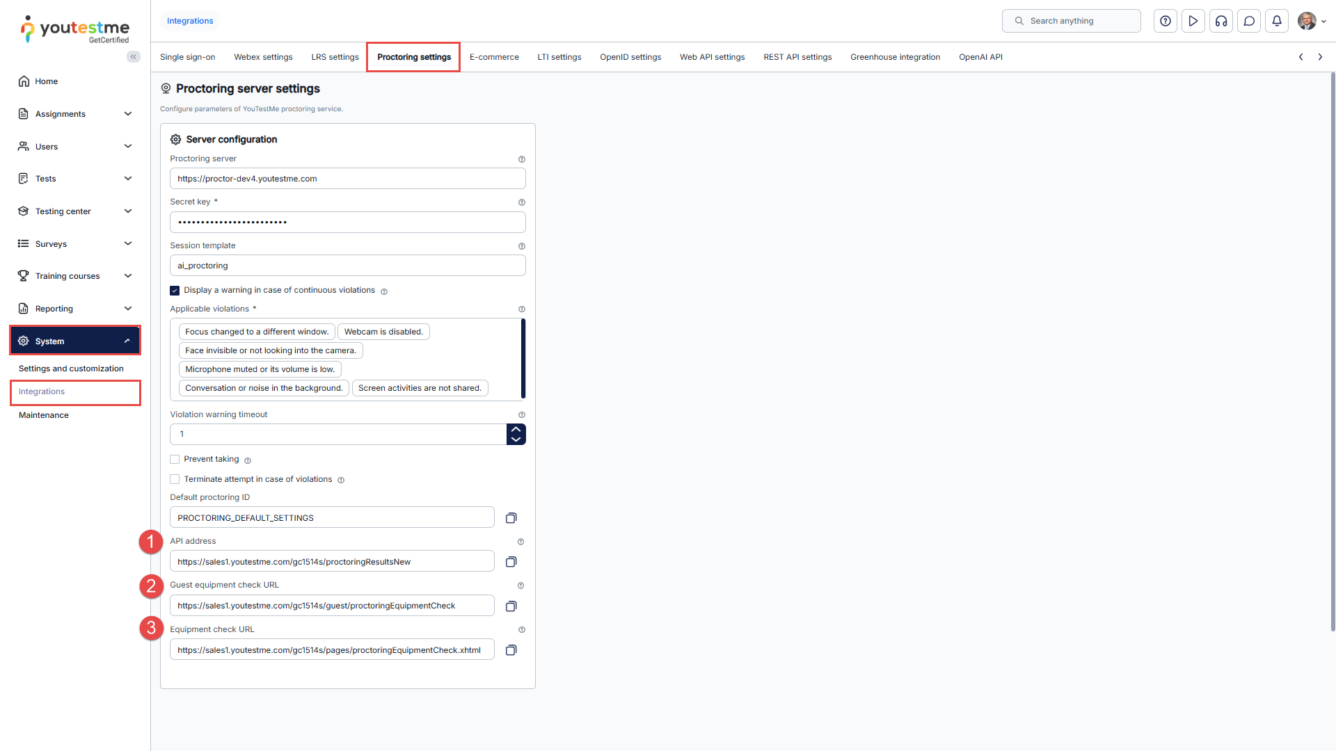 - The API address of your server allows you to receive proctoring results for each test once it is completed.