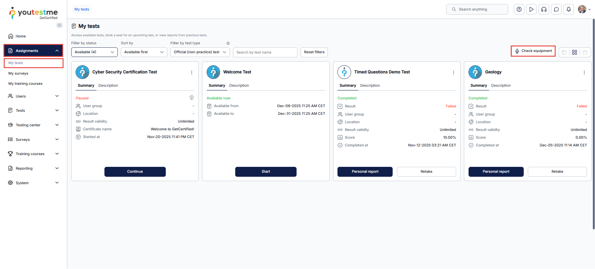 This article explains how a candidate can perform an equipment check before starting the test-taking process to ensure that the equipment is suitable and will work for the official test. An equipment check can be performed an unlimited number of times.