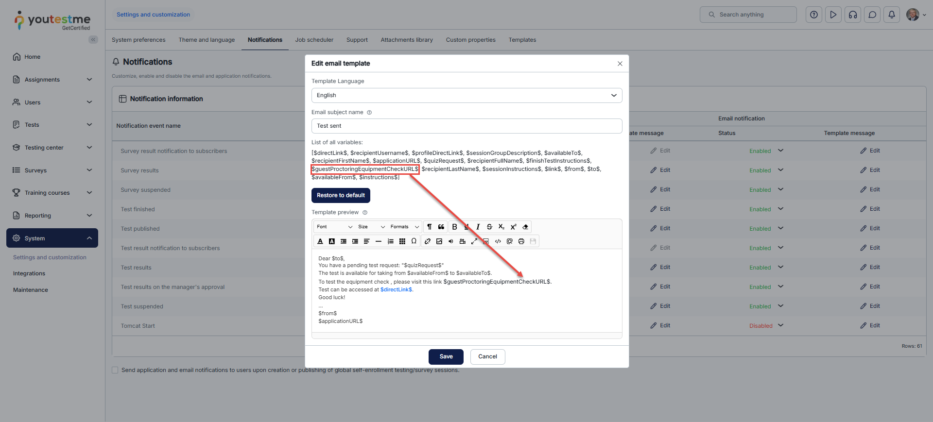 - The Guest equipment check URL allows users to check their equipment for a proctored test without signing in to the system. The link is a parameter in the email notification and can be shared with users to verify their equipment before signing in.