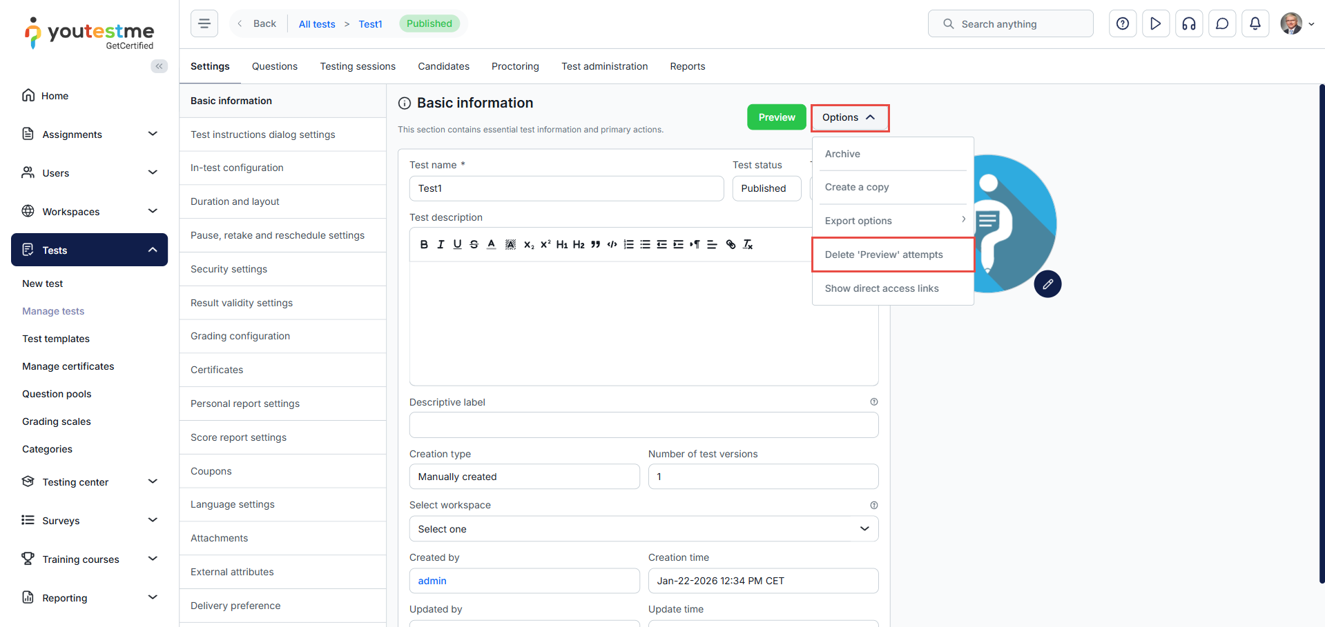 To delete the preview attempts, click the option button and select the Delete ‘Preview’ attempts.