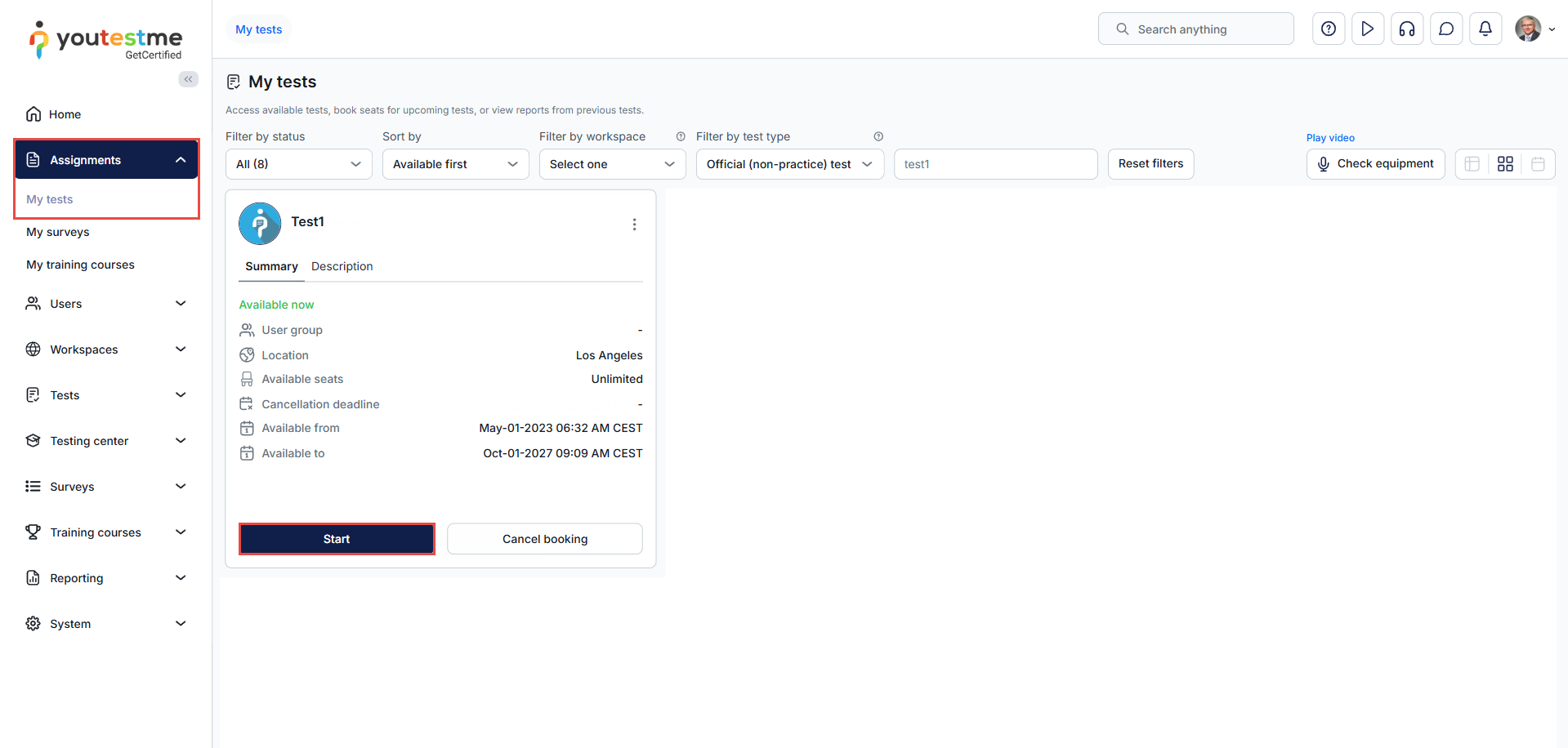 Once you are assigned to the test, you can find and take it by navigating to the Assignments tab in the main menu, selecting My Tests in the sub-menu, and clicking Start.