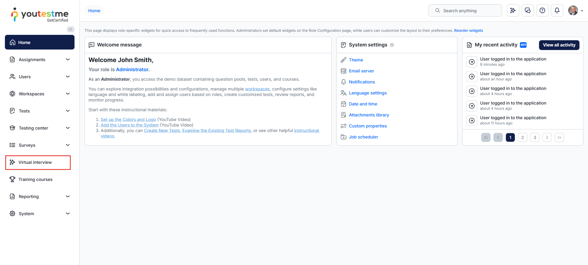 To access the Virtual Interview module, select Virtual interview from the main menu.