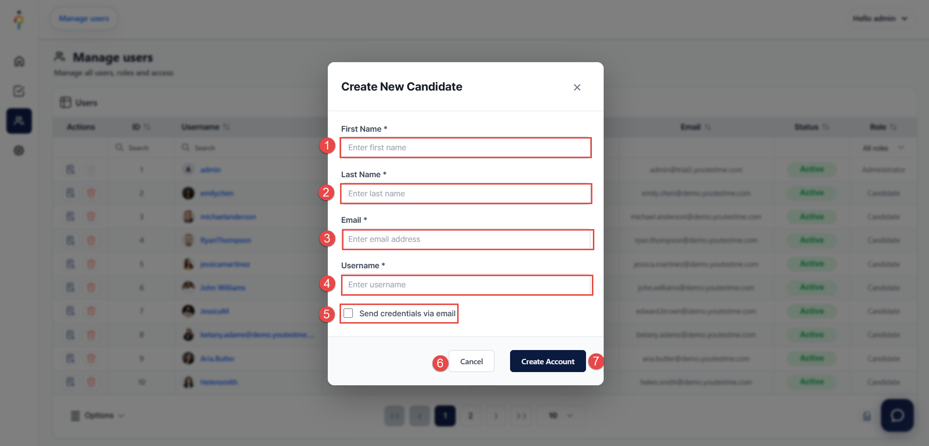 To create a new candidate account: