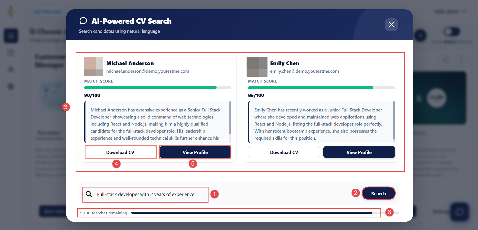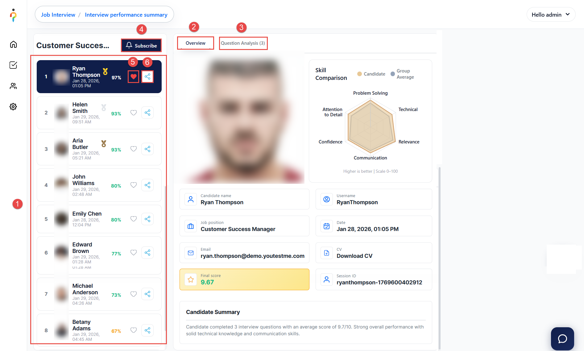 4. View Rankings – Access results and rankings for all candidates who completed the interview.