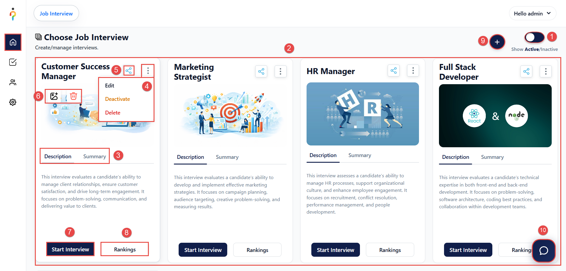 1. Toggle Active/Inactive Interviews – Switch interviews between Active and Inactive status.
