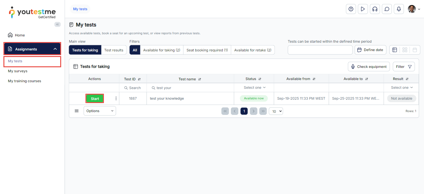 You can begin your test by going to Assignment > My Tests, using the filters to search for the test by its availability or name, and then clicking the Start button.