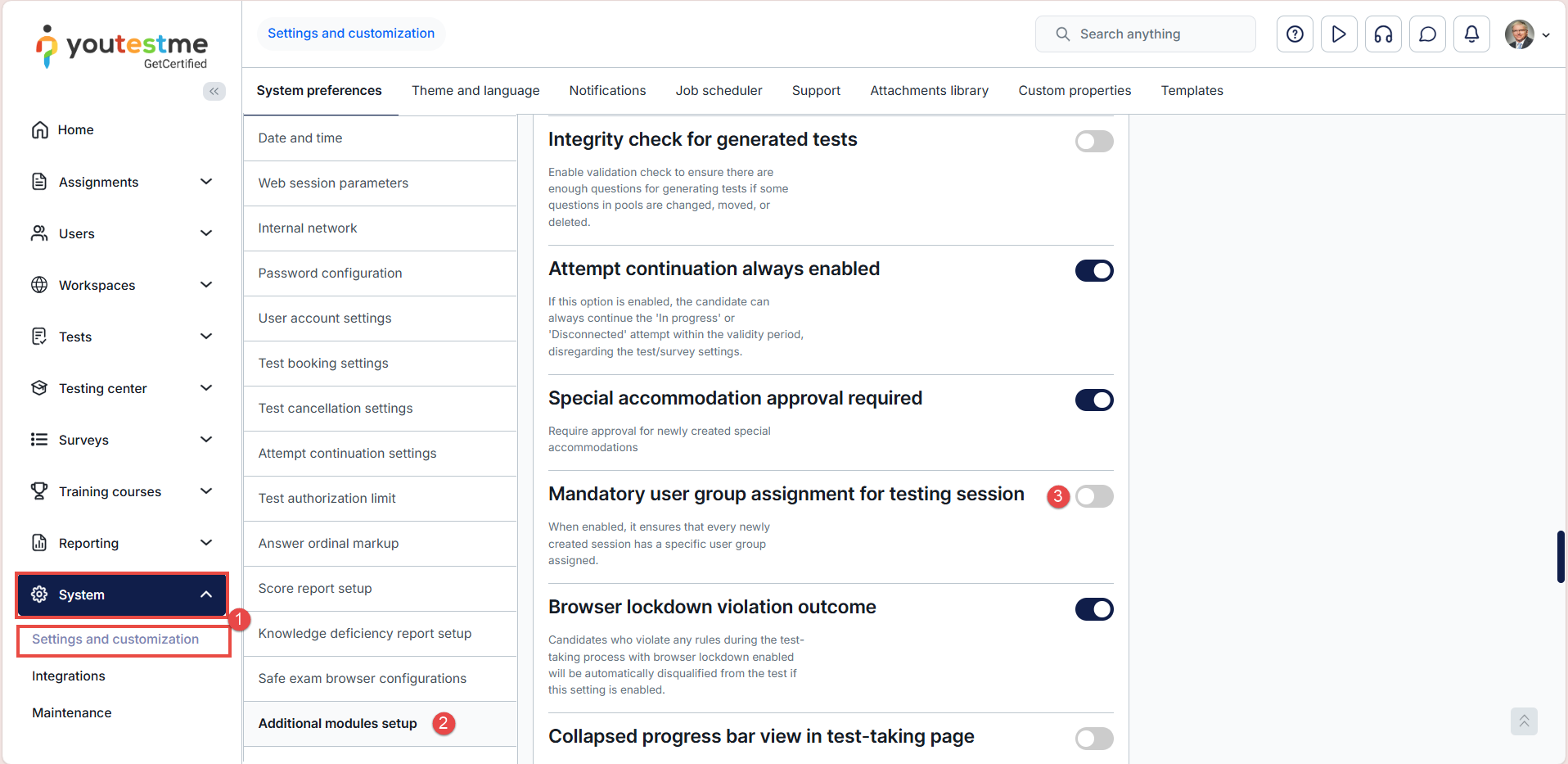 When this option is enabled, users cannot create or save a testing session without selecting a user group, helping organizations keep sessions organized, properly targeted, and compliant with internal rules.