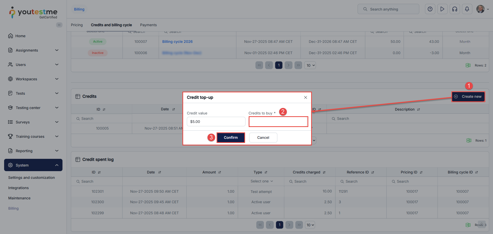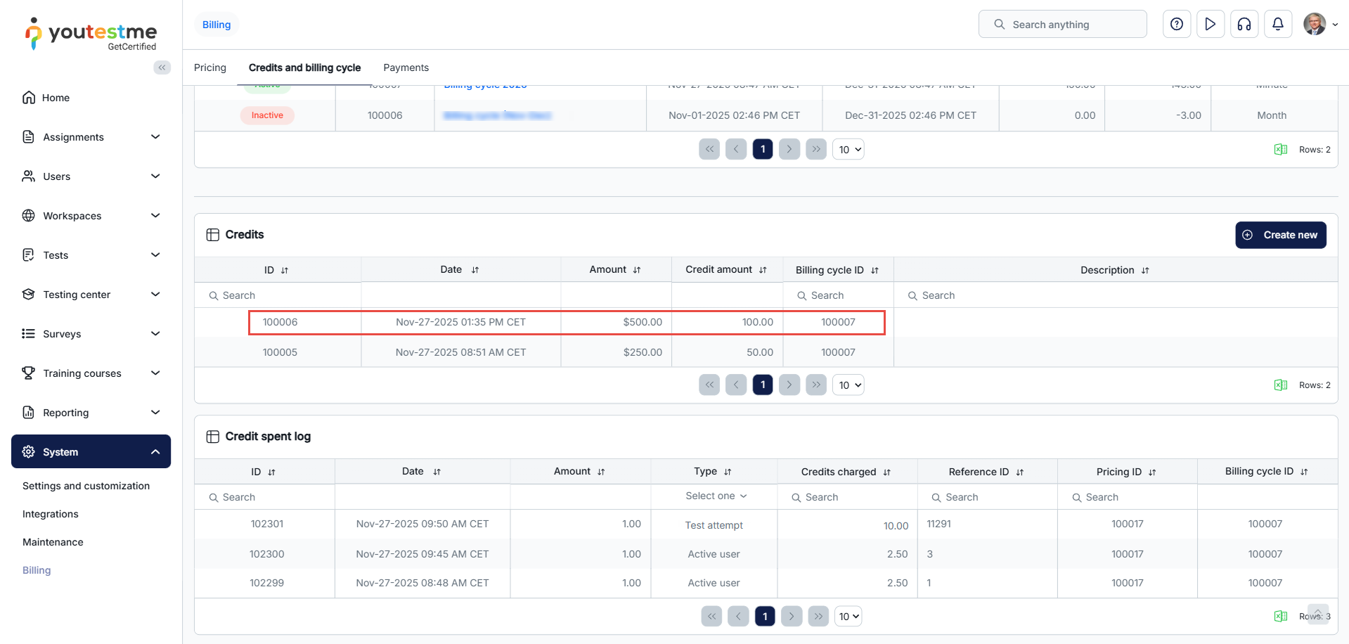 Your purchased credits will appear in the Credits table under the active billing cycle.