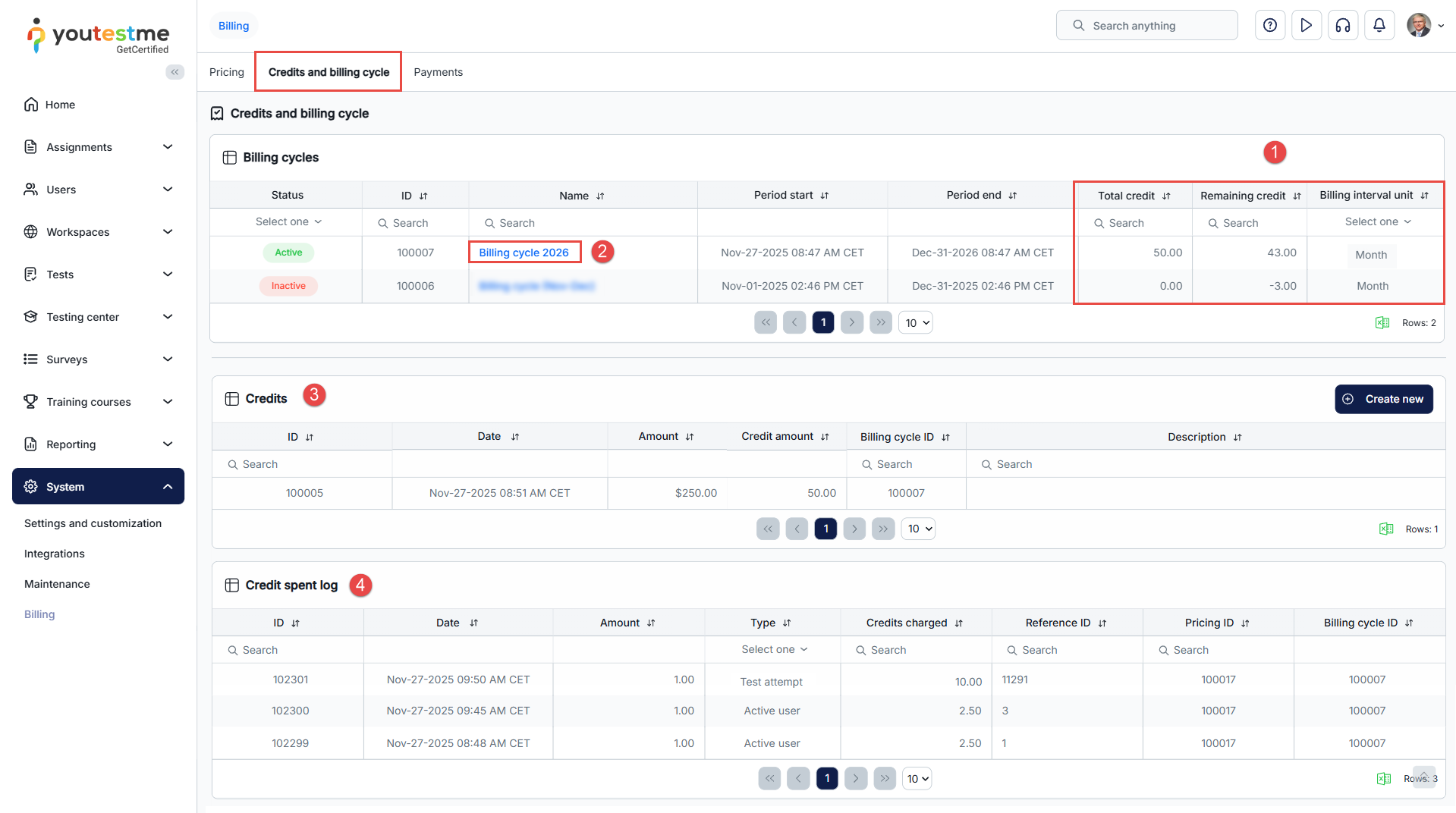 Reviewing credit spent history – This section displays a detailed table of all events where credits were consumed within the selected billing cycle. Each row represents a charging event and includes the ID, date, amount of credits before charging, type of consumption (such as monthly license, test attempt, or active user), credits charged, and additional reference details like Reference ID, Pricing ID, and Billing Cycle ID. This log provides a clear overview of when, how, and why credits were deducted.