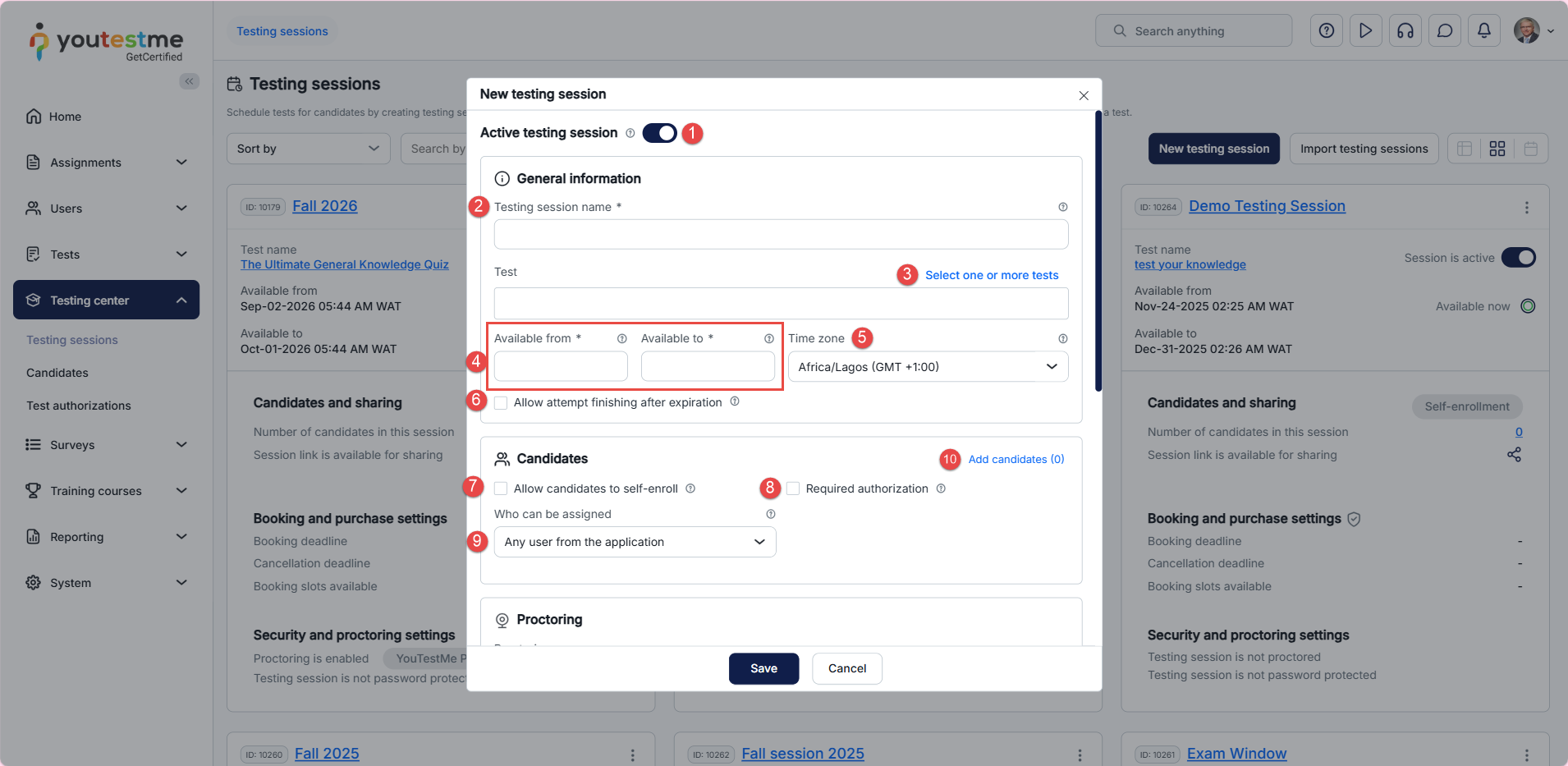 - Time Zone: Set the time zone for the session. The availability period will be automatically converted and displayed to test-takers based on the time zone defined in their profile settings.