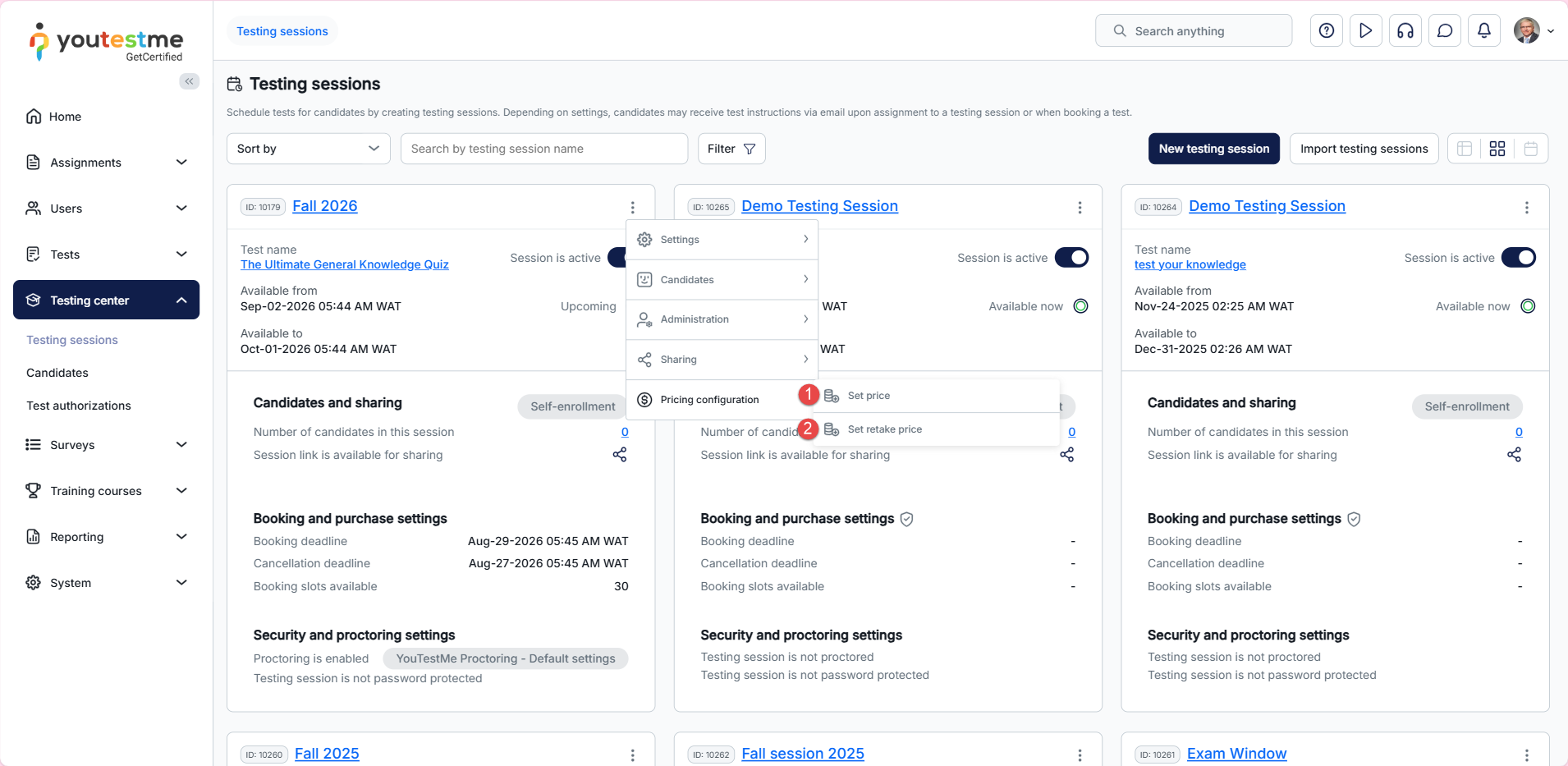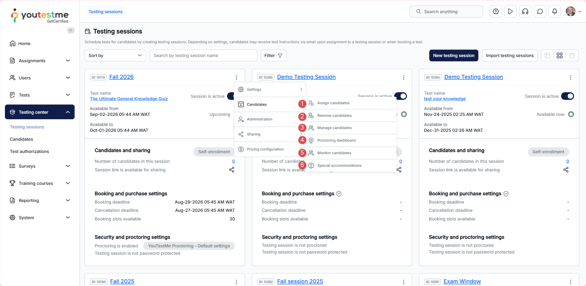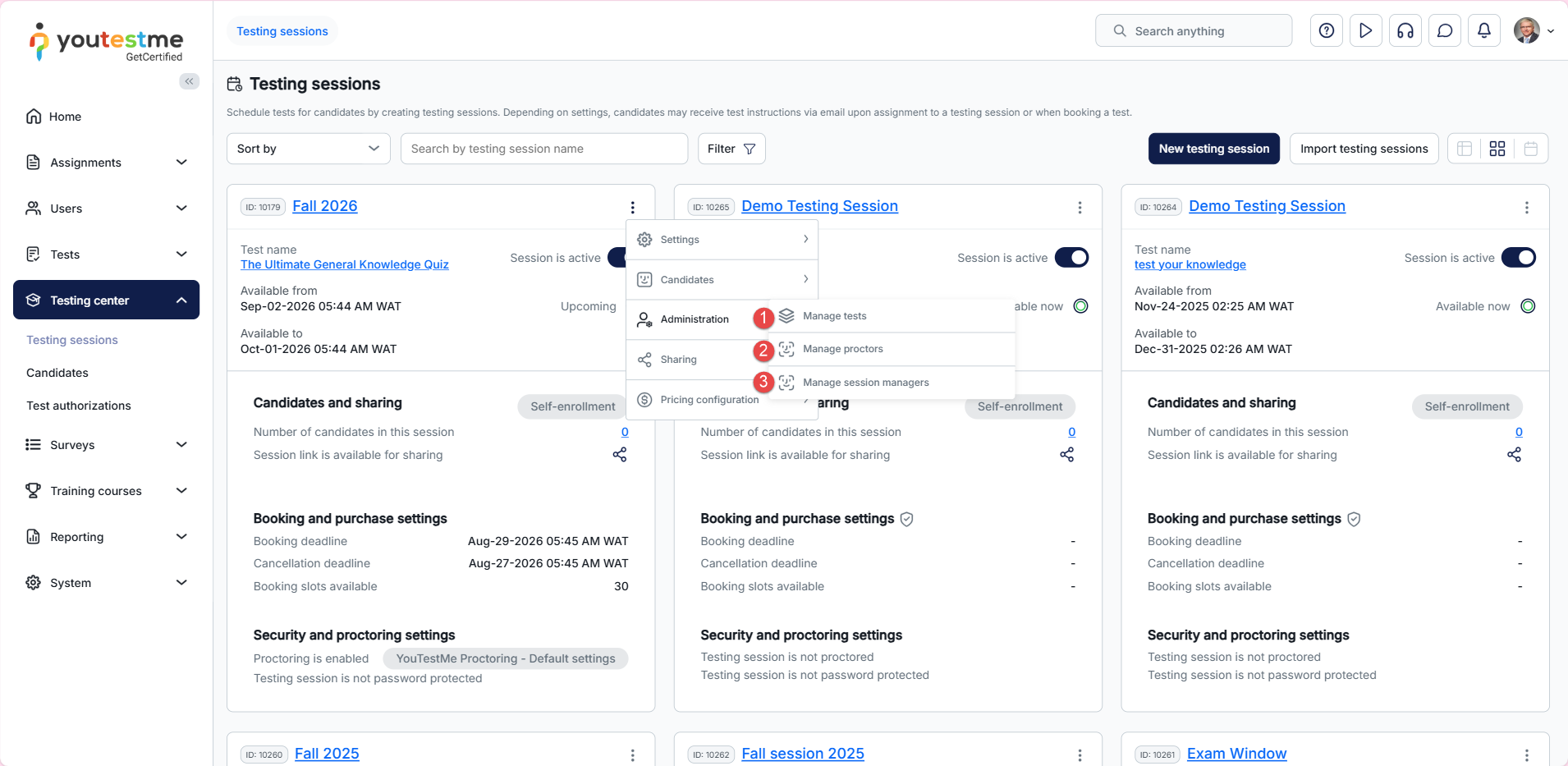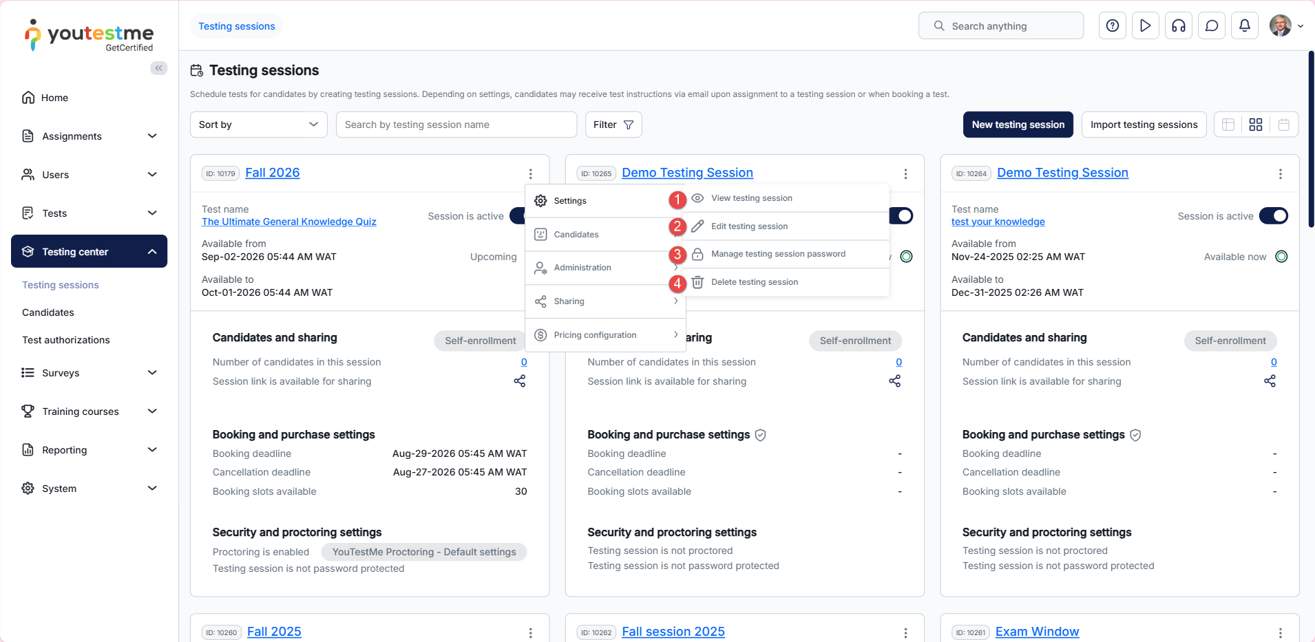 - Delete session: Permanently remove the testing session from the system. The session can be deleted only if no candidates are assigned.