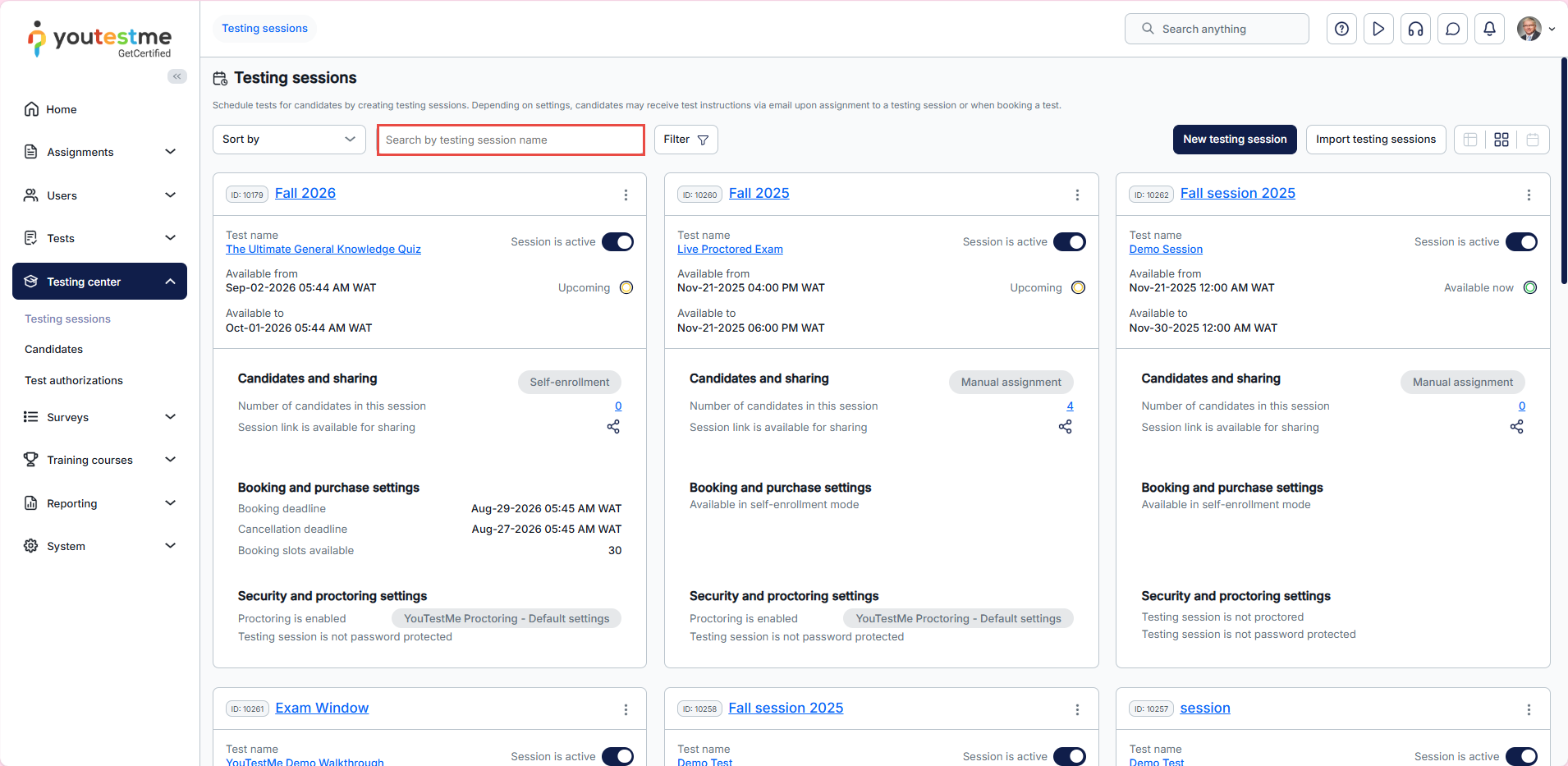 Once the session is created, it will appear on the Testing sessions page, where you can use the search bar to find the desired session.