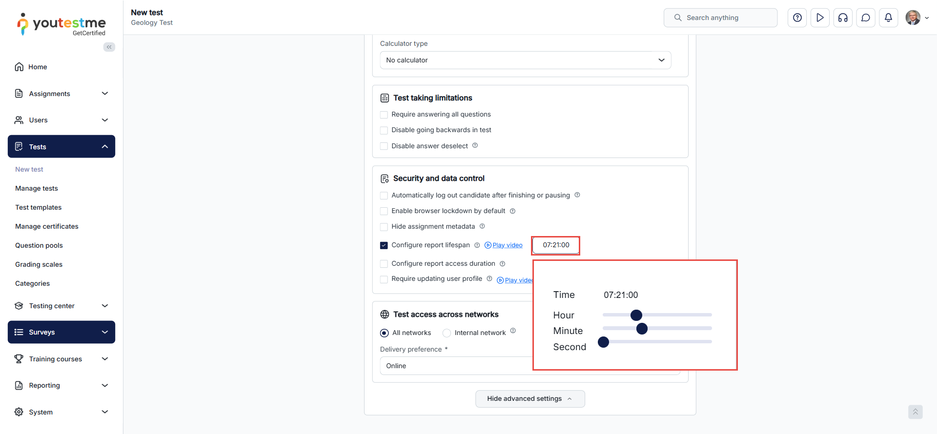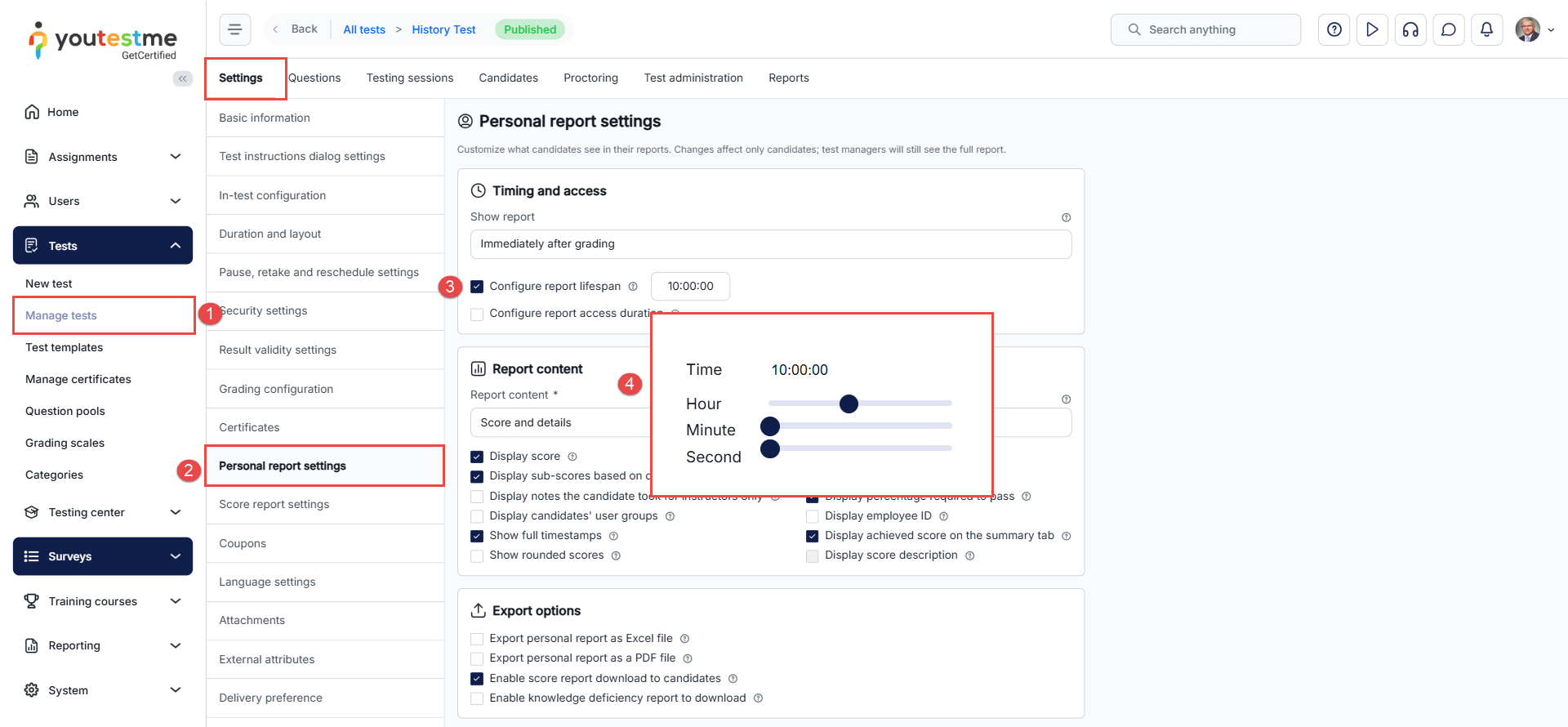 This article explains how to set a time limit for a personal report. A personal report includes the final test score and detailed information about the questions. By configuring the report lifespan, you can control how long candidates are allowed to access their detailed results before access is restricted.