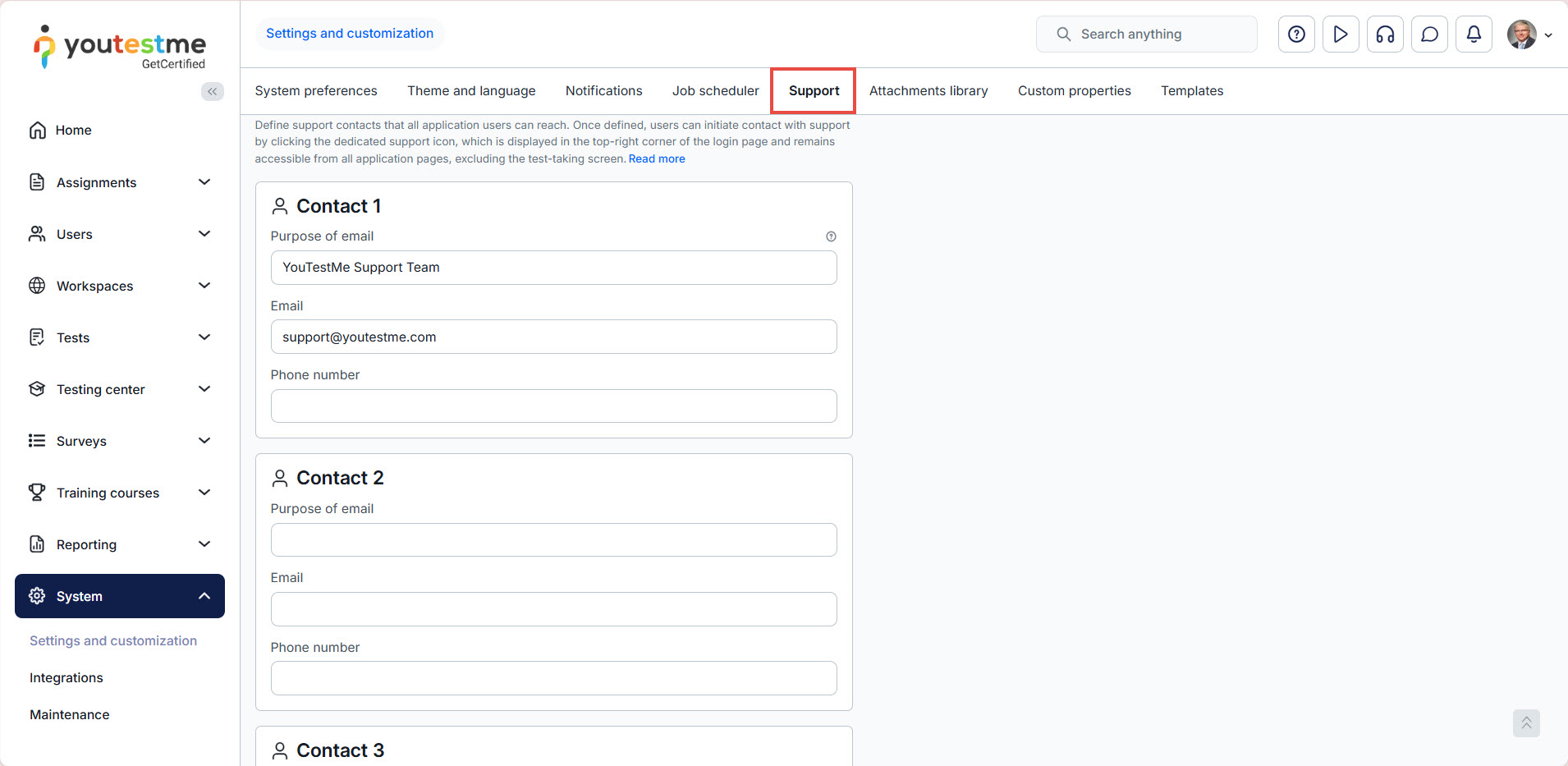 To define the support contact, select “System” from the left-side menu and choose “Settings and customization”, then navigate to the “Support” tab.