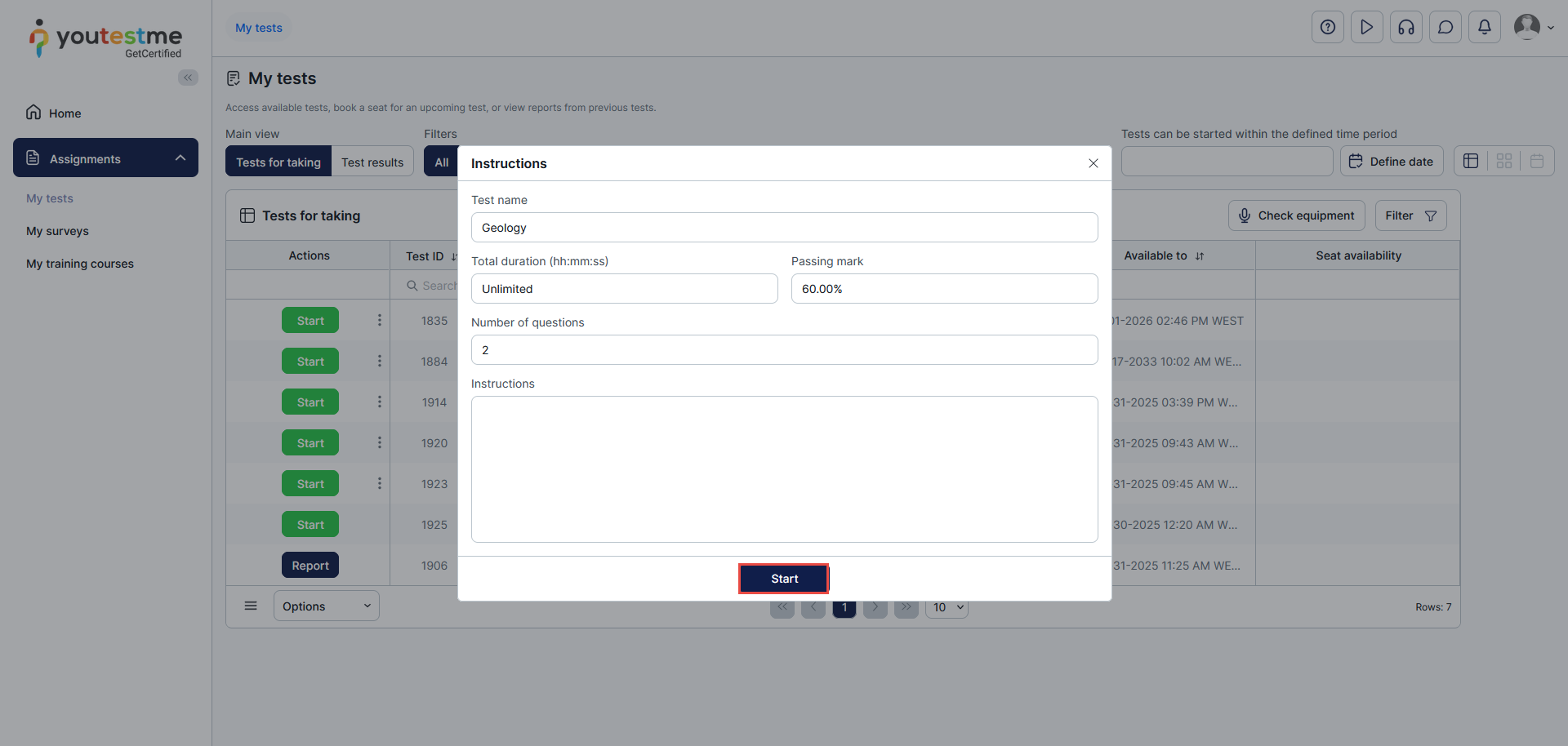 A candidate logs in to the application and chooses the test by clicking the Start button.