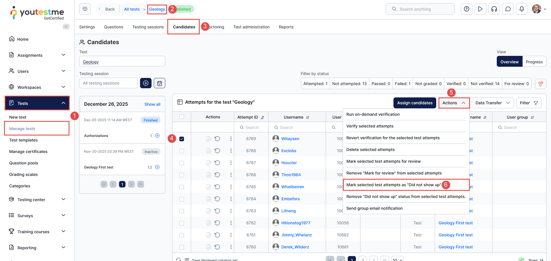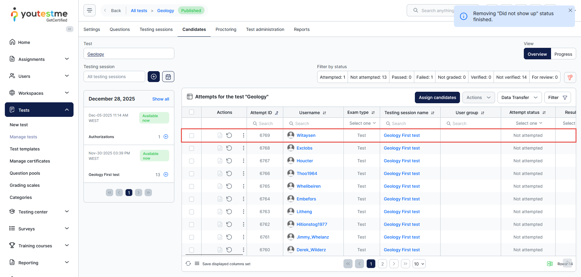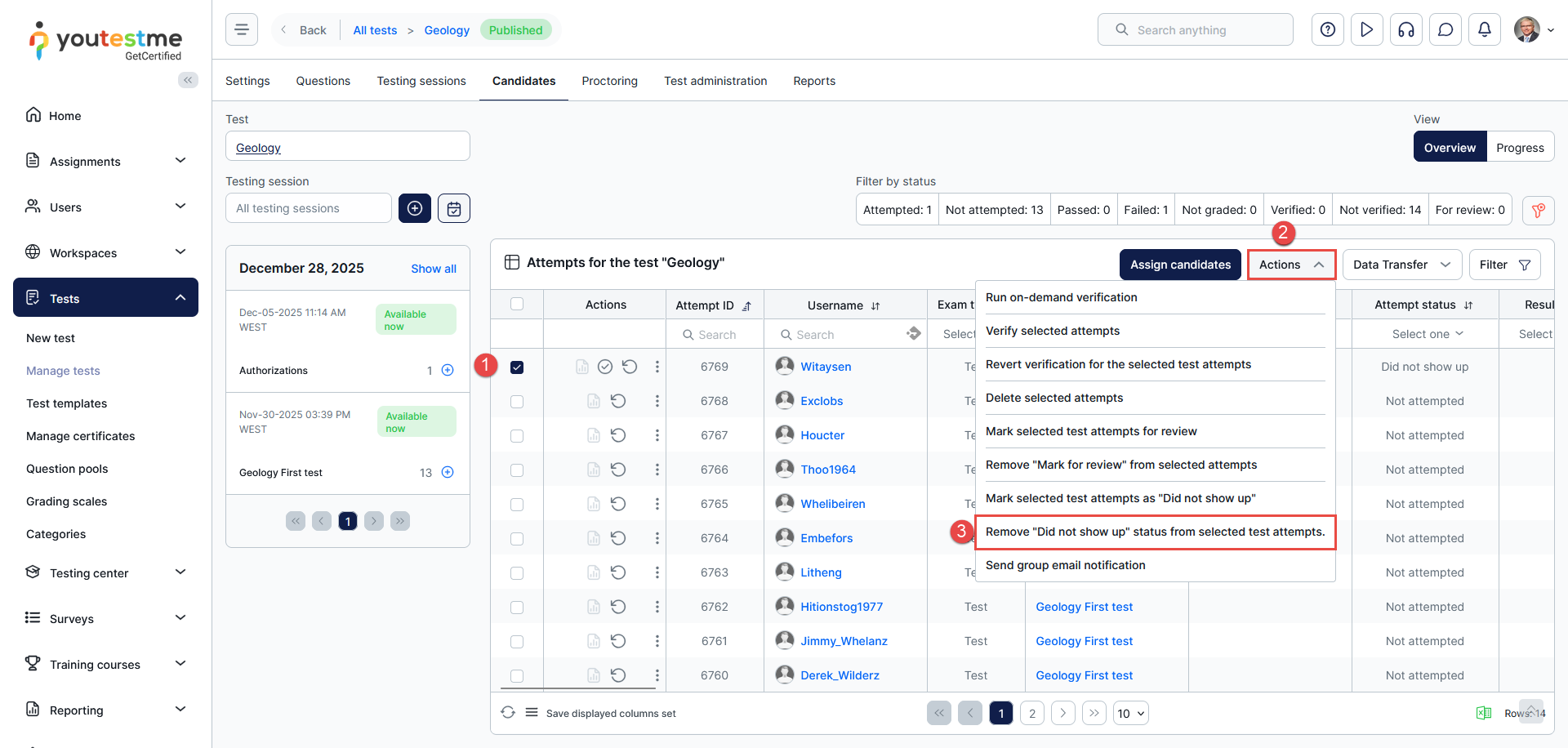 Note: If you previously verified results for the candidate with ” Did not show up” status, you can’t remove the “Did not show up” status for that candidate. Only the non-verified attempts can be reverted to the “Not attempted” status.