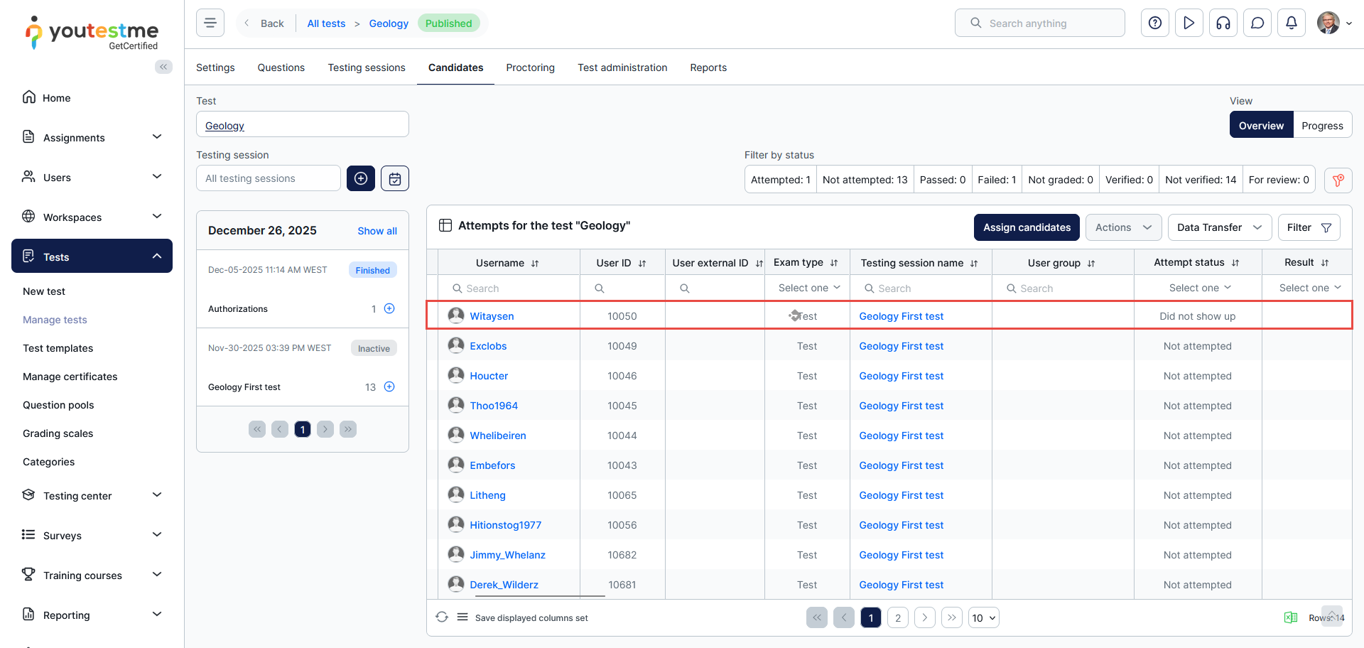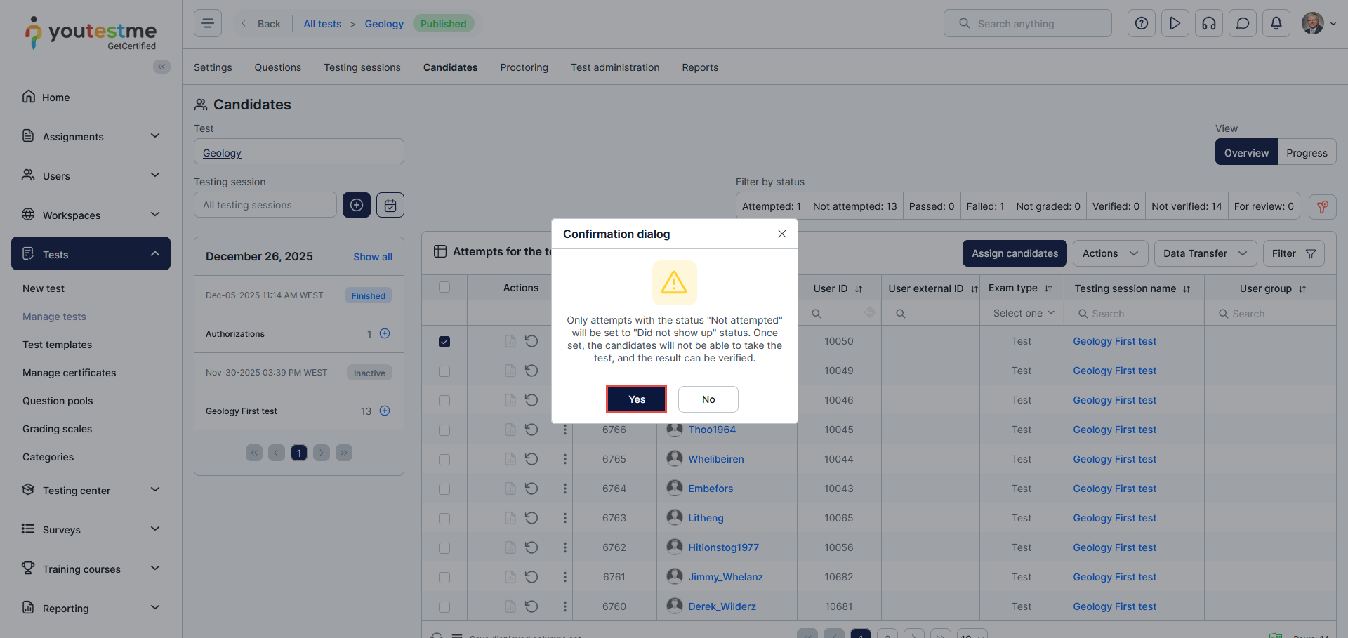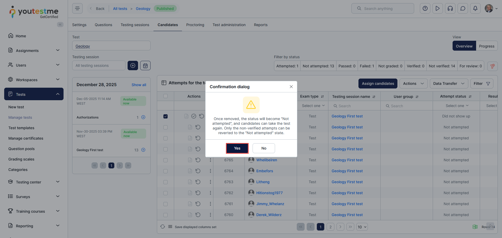 Note: If you previously verified results for the candidate with ” Did not show up” status, you can’t remove the “Did not show up” status for that candidate. Only the non-verified attempts can be reverted to the “Not attempted” status.