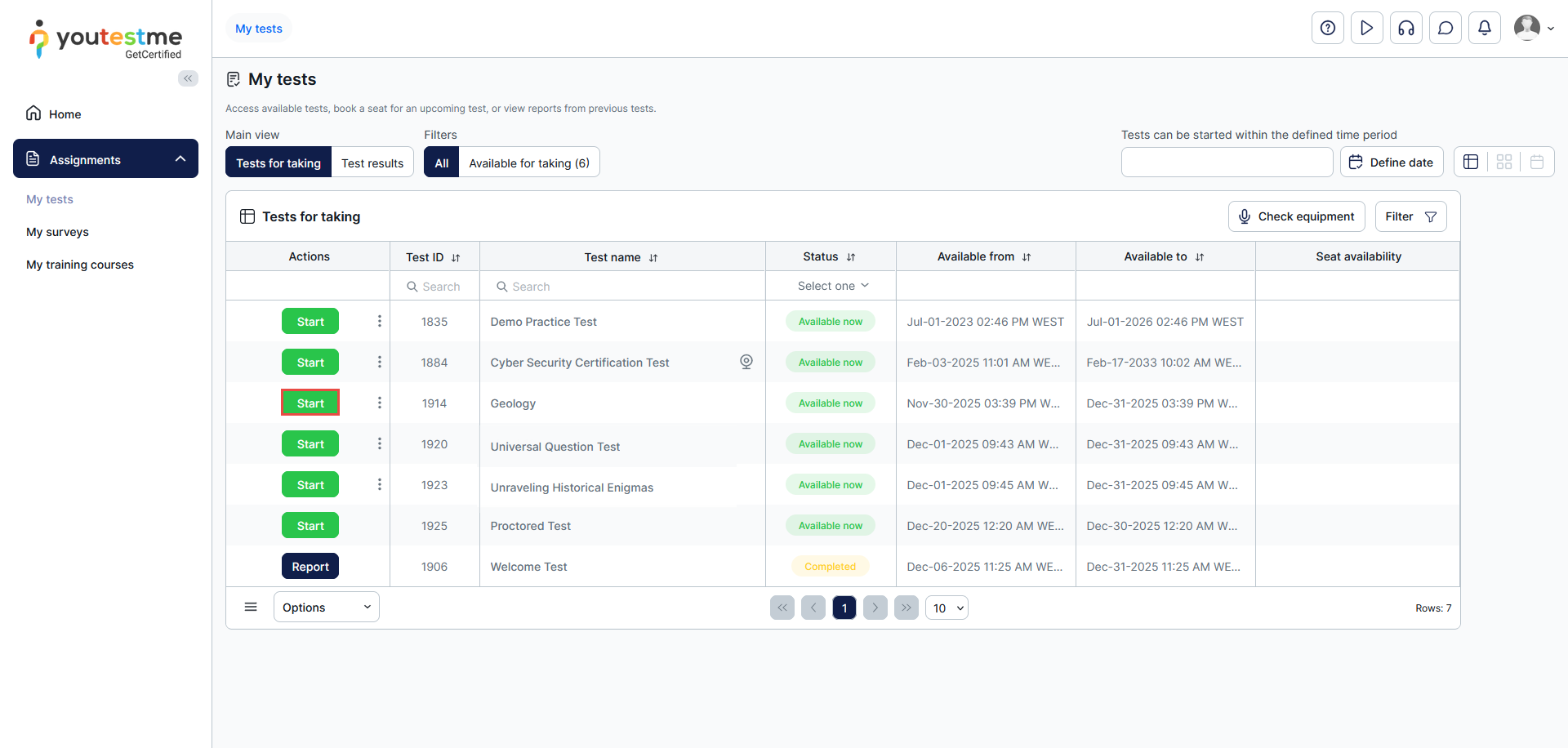 A candidate logs in to the application and chooses the test by clicking the Start button.