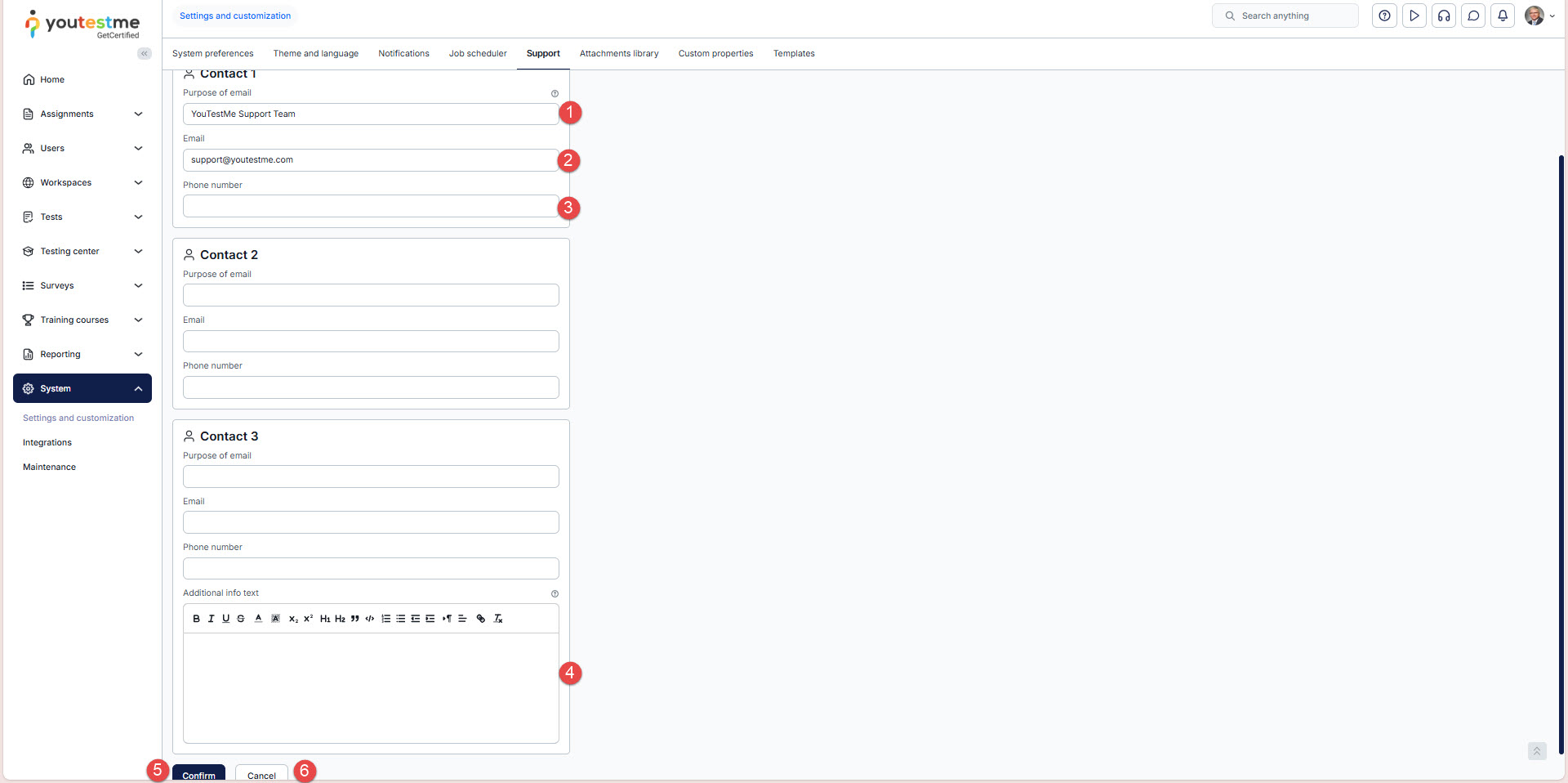 - Email – Provide the desired support email address. The first “Email” field is mandatory and will serve as the default email address.