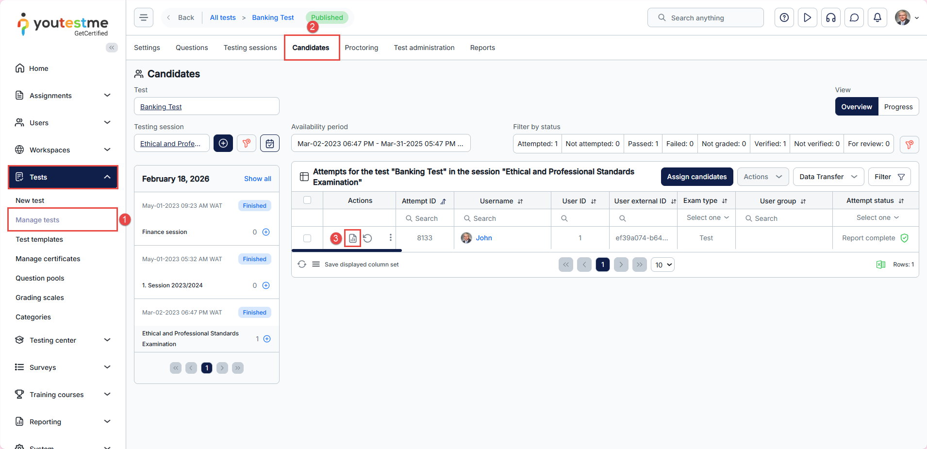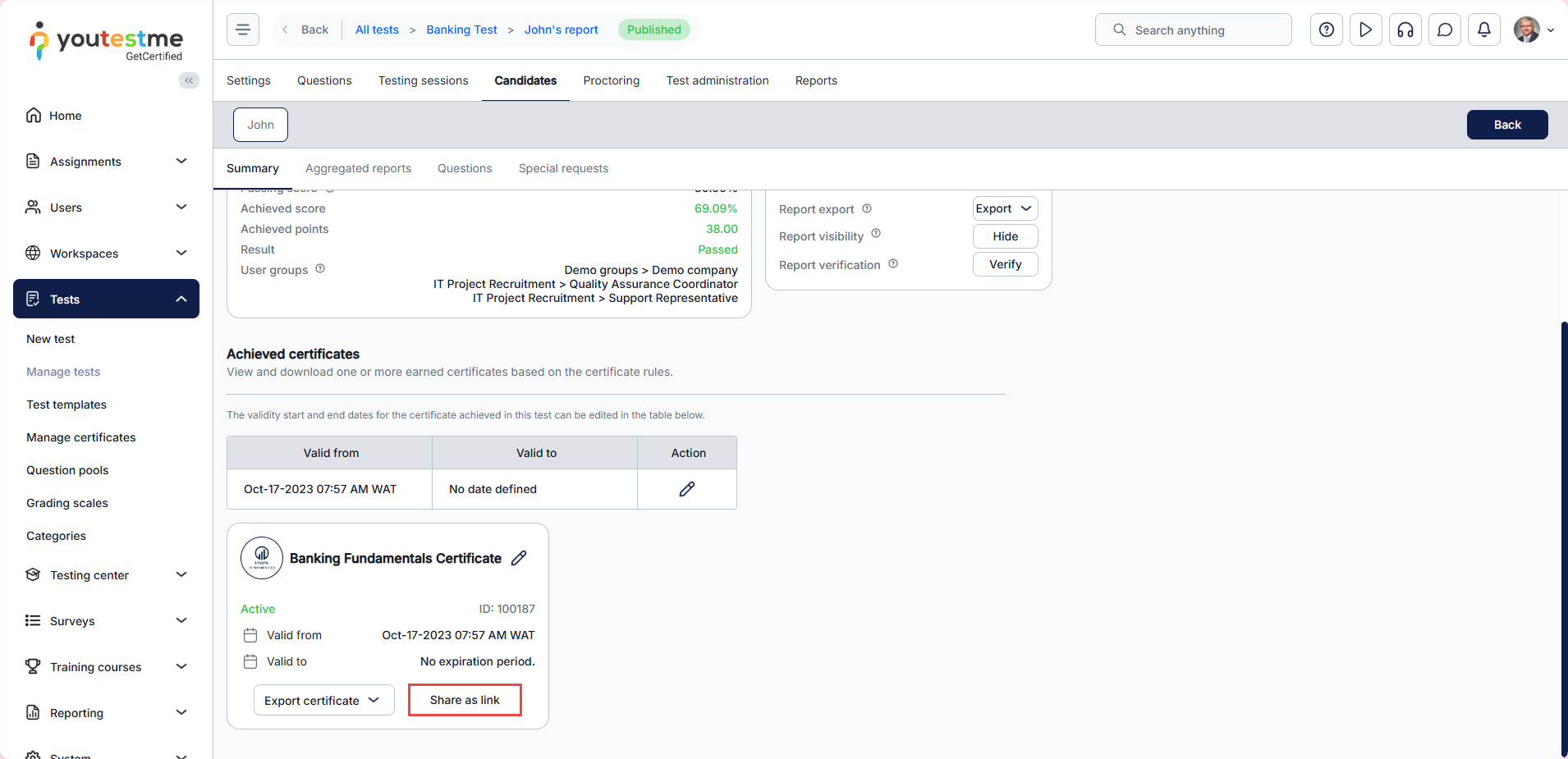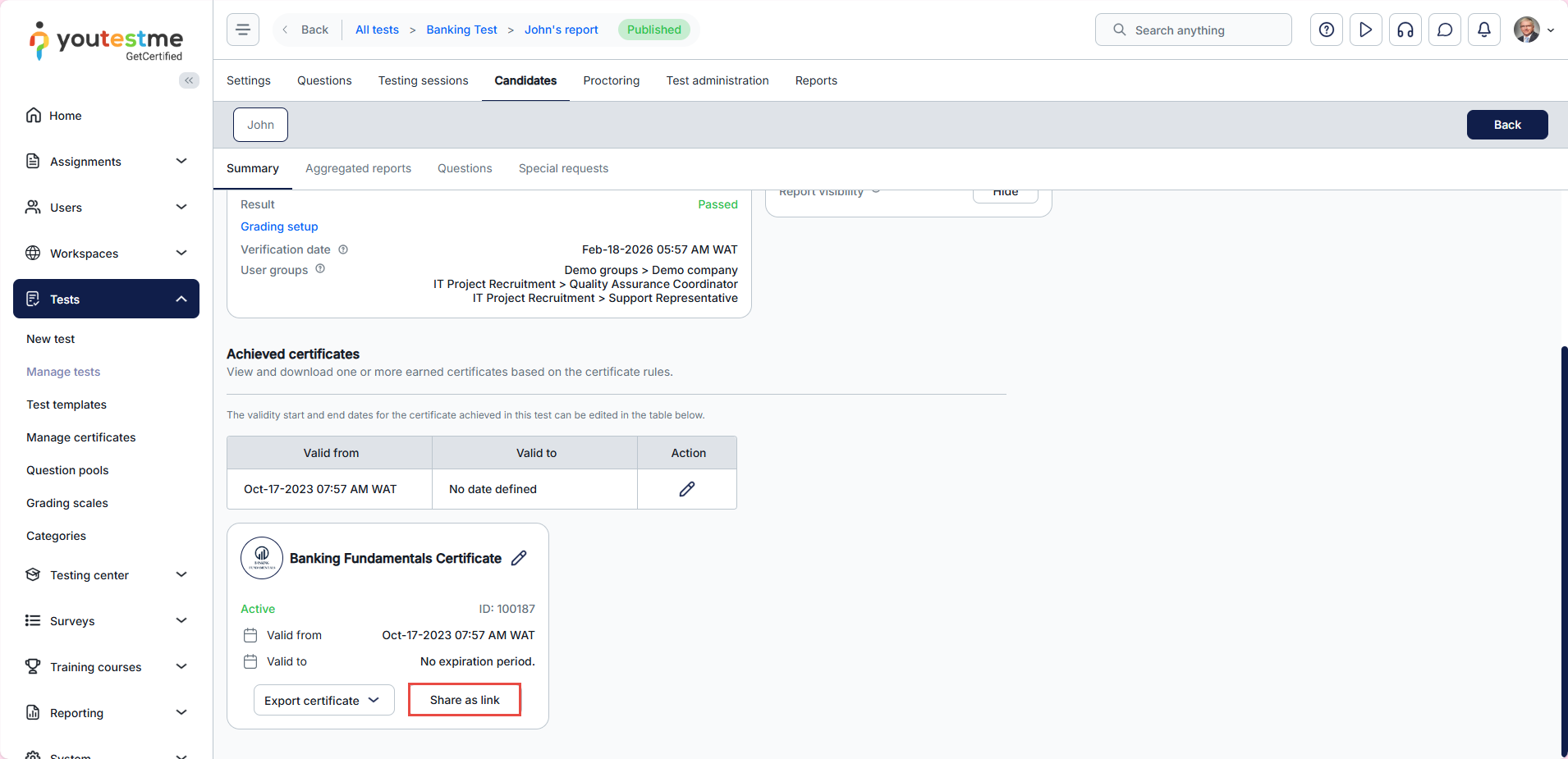 After a candidate completes a test, you can access their personal report and share the certificate link by following these steps: