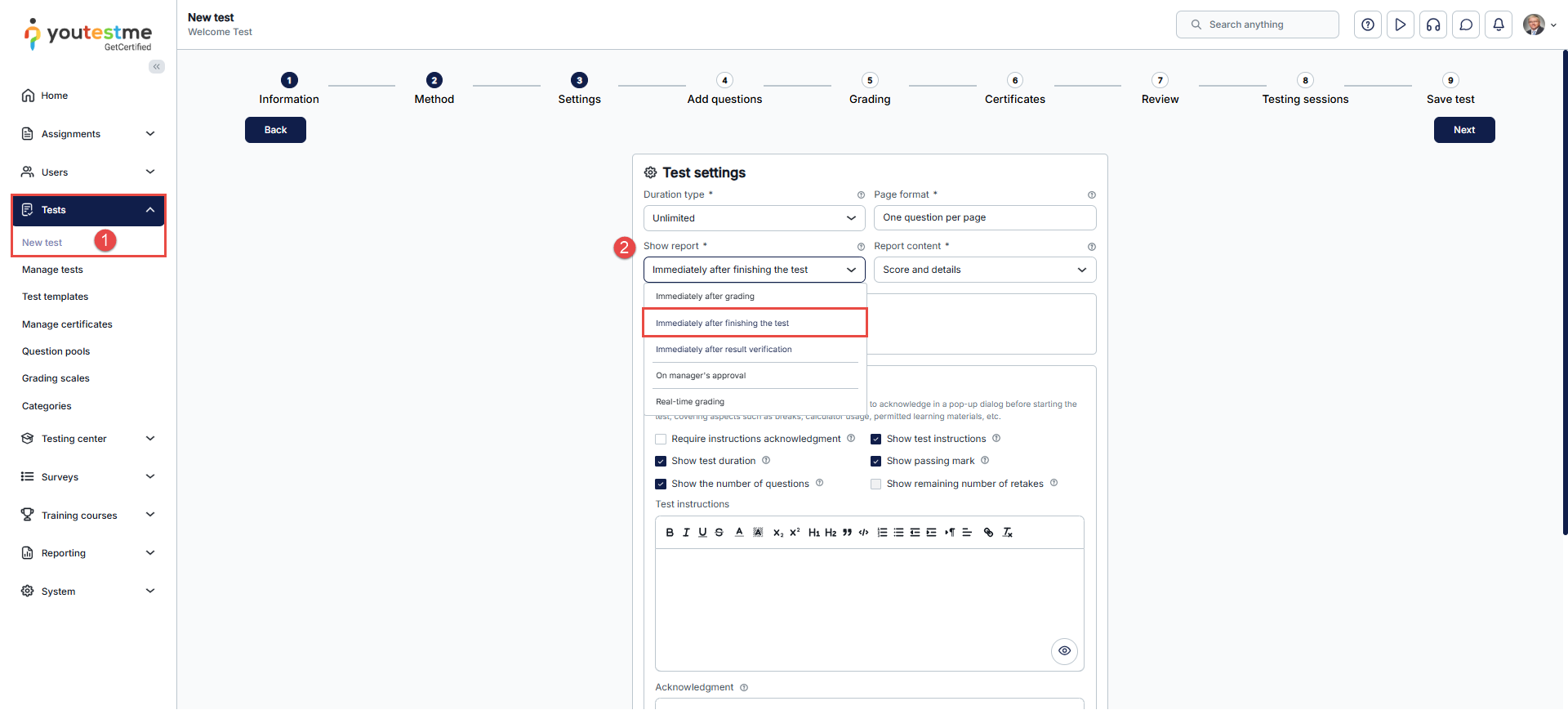 - In the third step of the test creation wizard, select Show report, then choose the Immediately after finishing the test option.