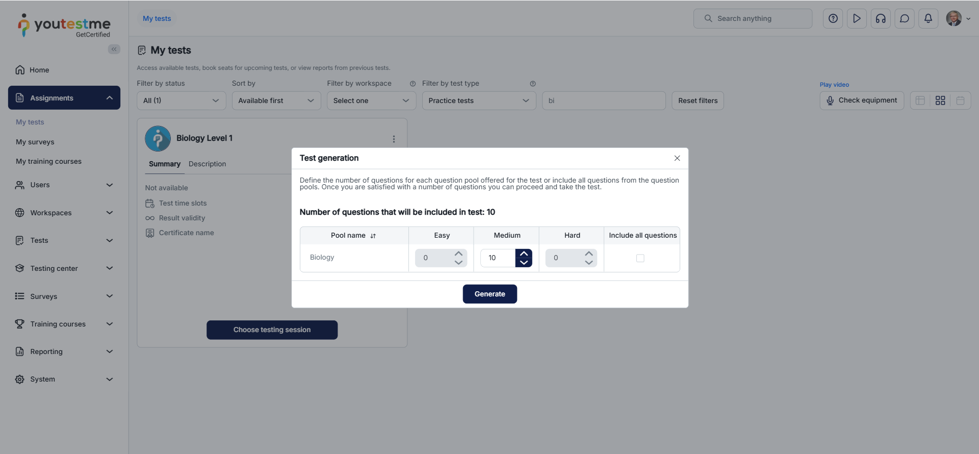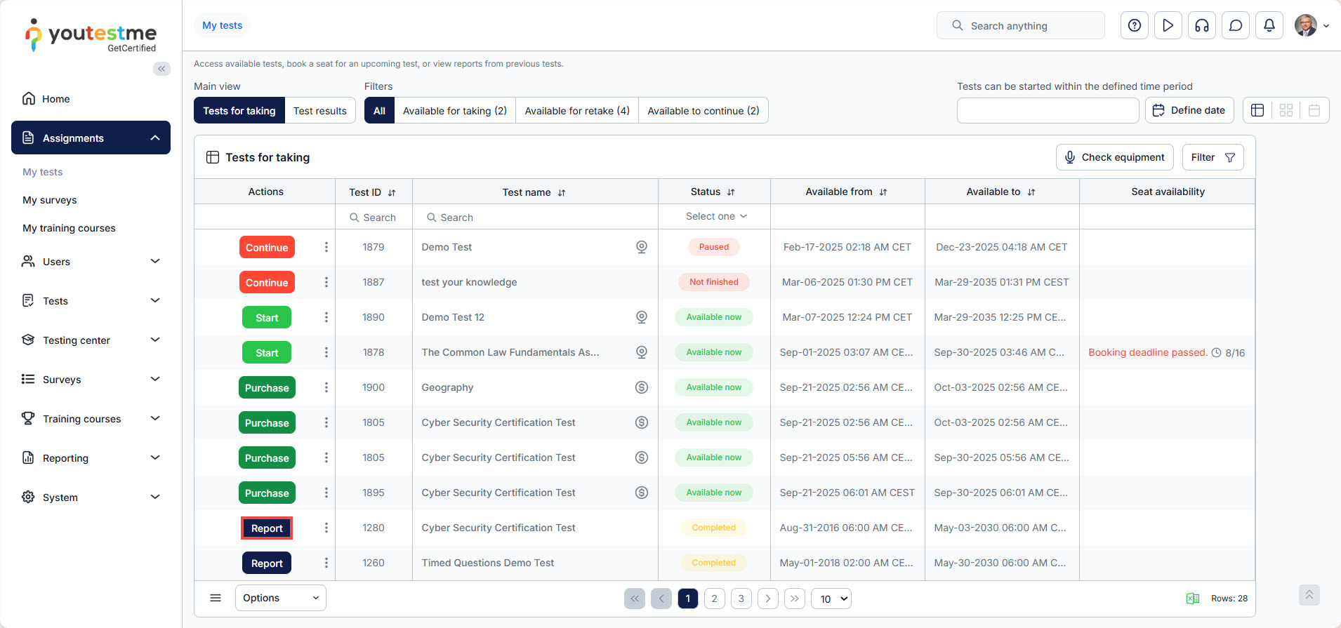 If the Practice test option is enabled, you can use practice tests to prepare for the official test. On the Assignments page, filter the test type to practice tests.
