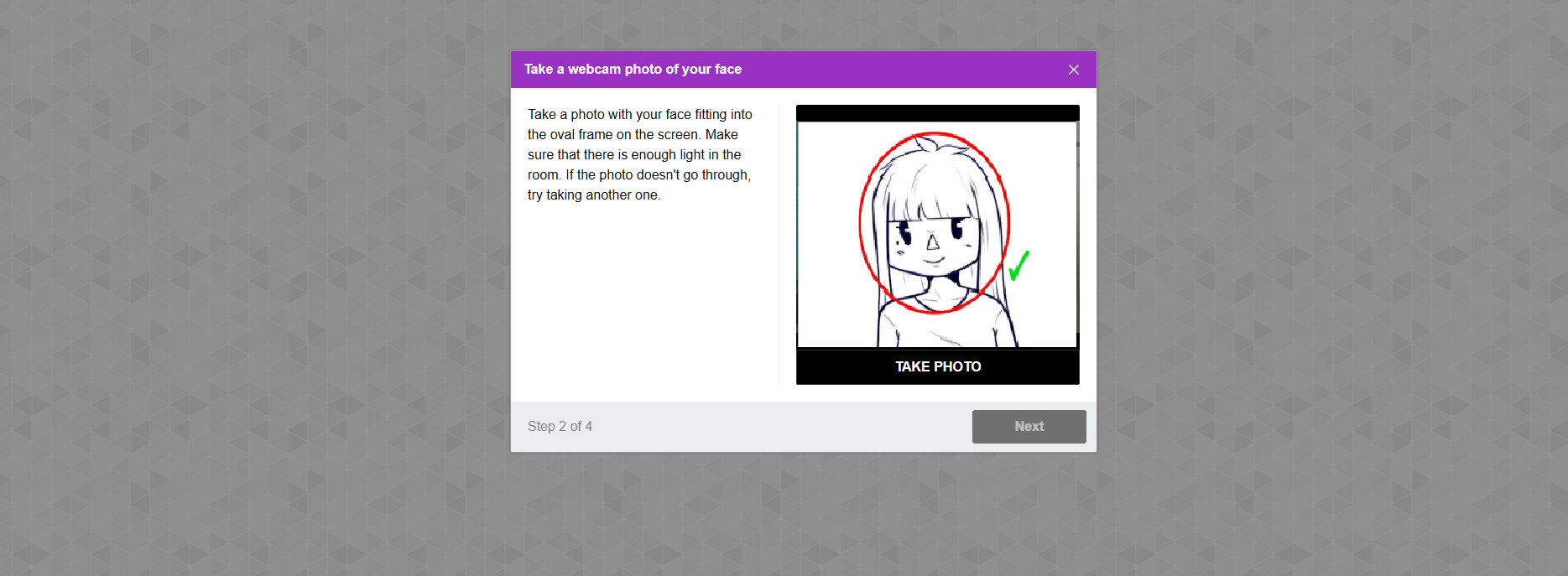 In the following step, the system will take your picture to compare it to the person in front of the camera during the test and validate your test attempt.