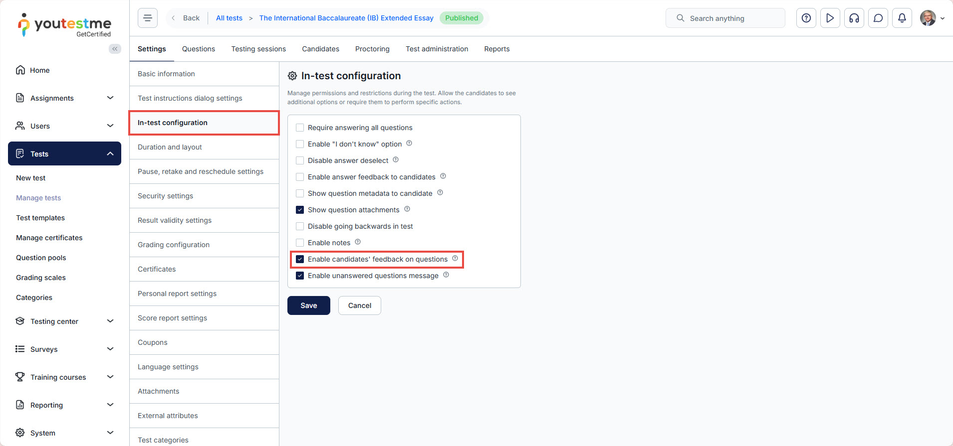 Require updating profile information is enabled – A pop-up for updating your personal information will appear when you accept the test instructions. Here, you can:
